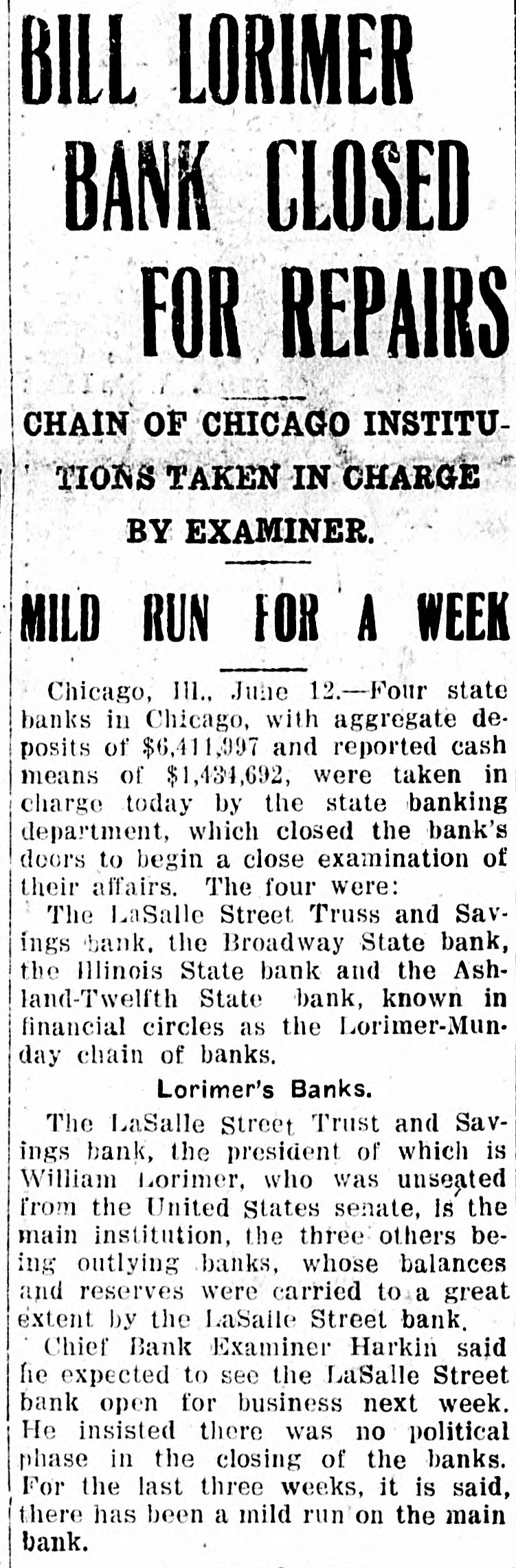 BILL LORIMER BANK CLOSED FOR REPAIRS CHAIN OF CHICAGO INSTITUTIONS TAKEN IN CHARGE BY EXAMINER. MILD RUN FOR A WEEK Chicago, III.. Juhe 12.-Four state banks in Chicago, with aggregate deposits of $6,411,997 and reported cash means of $1,434,692, were taken in charge today by the state banking department, which closed the bank's doors to begin a close examination of their affairs. The four were: The LaSalle Street Truss and Savings bank. the Broadway State bank, the Illinois State bank and the Ashland-Twelfth State bank, known in financial circles as the Lorimer-Munday chain of banks. Lorimer's Banks. The LaSalle Street Trust and Savings bank, the president of which is William Lorimer, who was unseated from the United States senate, is the main institution, the three others being outlying banks, whose balances and reserves were carried to a great extent by the LaSaile Street bank. Chief Bank Examiner Harkin said he expected to see the LaSalle Street bank open for business next week. He insisted there was no political phase in the closing of the banks. For the last three weeks, it is said, there has been a mild run on the main bank.