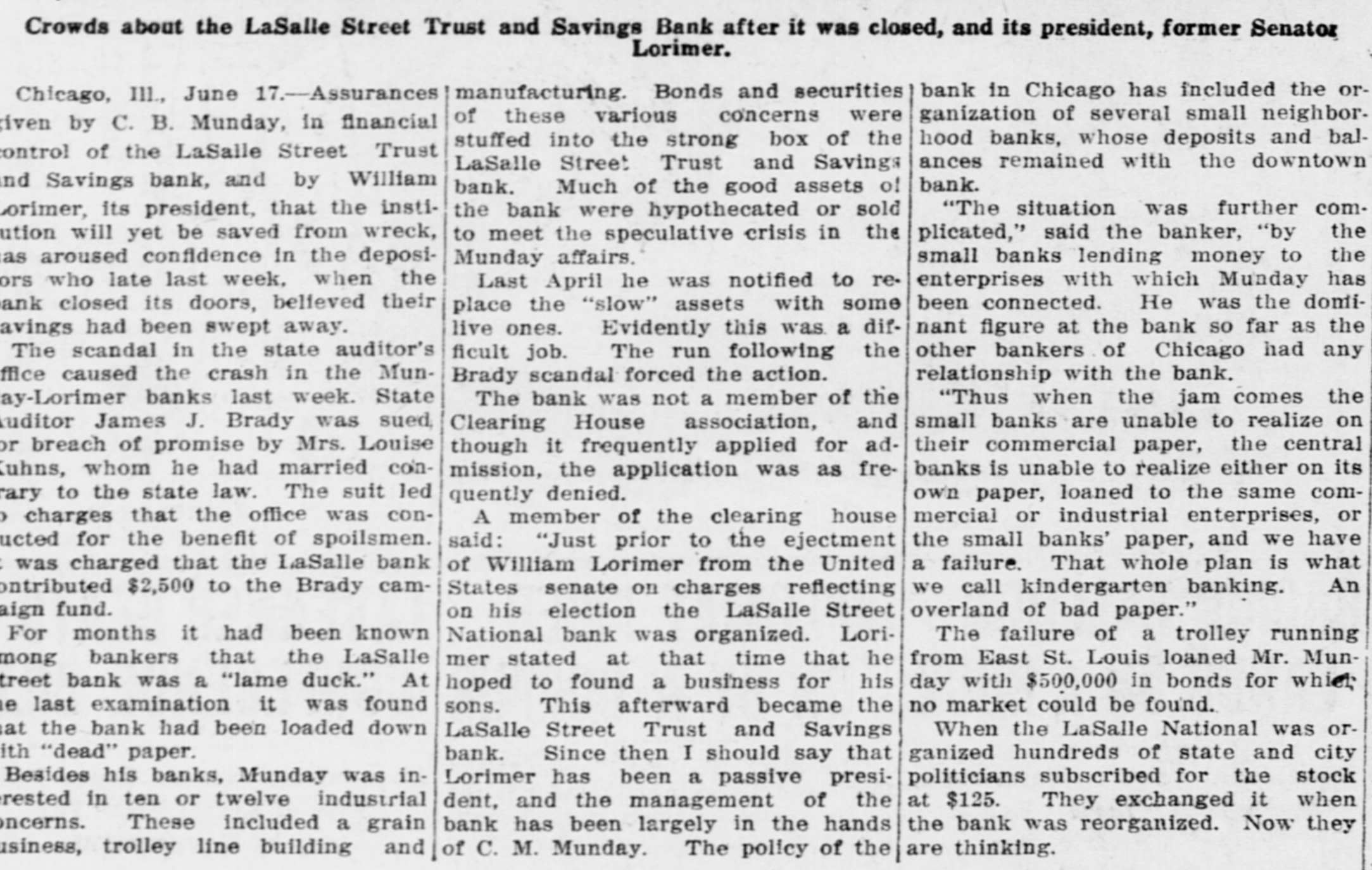 Crowds about the LaSalle Street Trust and Savings Bank after it was closed, and its president, former Senator Lorimer. bank in Chicago has included the ormanufacturing. Bonds and securities Chicago, Ill., June 17.-Assurances of these various concerns were ganization of several small neighborby C. B. Munday, in financial hood banks, whose deposits and balstuffed into the strong box of the ontrol of the LaSalle Street Trust ances remained with the downtown LaSalle Street Trust and Savings Savings bank, and by William bank. bank. Much of the good assets of "The situation was further comLorimer, its president, that the instithe bank were hypothecated or sold ution will yet be saved from wreck, plicated," said the banker, "by the to meet the speculative crisis in the aroused confidence in the deposismall banks lending money to the Munday affairs. who late last week, when the enterprises with which Munday has Last April he was notified to rebeen connected. He was the domiiclosed its doors, believed their place the "slow" assets with some nant figure at the bank so far as the avings had been swept away. live ones. Evidently this was a difThe scandal in the state auditor's other bankers of Chicago had any ficult job. The run following the ffice caused the crash in the Munrelationship with the bank. Brady scandal forced the action. The bank was not a member of the "Thus when the jam comes the ay-Lorimer banks last week. State small banks are unable to realize on auditor James J. Brady was sued, Clearing House association, and their commercial paper, the central breach of promise by Mrs. Louise though it frequently applied for adbanks is unable to realize either on its Kuhns, whom he had married coinmission, the application was as freto the state law. The suit led own paper, loaned to the same comquently denied. mercial or industrial enterprises, or charges that the office was conA member of the clearing house ucted for the benefit of spoilsmen. the small banks' paper, and we have said: "Just prior to the ejectment of William Lorimer from the United was charged that the LaSalle bank a failure. That whole plan is what ontributed $2,500 to the Brady camwe call kindergarten banking. An States senate on charges reflecting fund. on his election the LaSalle Street overland of bad paper." For months it had been known The failure of a trolley running National bank was organized. Lorifrom East St. Louis loaned Mr. Munmer stated at that time that he mong bankers that the LaSalle treet bank was a "lame duck." At day with $500,000 in bonds for which hoped to found a business for his last examination it was found no market could be found. sons. This afterward became the the bank had been loaded down When the LaSalle National was orLaSalle Street Trust and Savings "dead" paper. ganized hundreds of state and city bank. Since then I should say that Besides his banks, Munday was inLorimer has been a passive presipoliticians subscribed for the stock rested in ten or twelve industrial at $125. They exchanged it when dent, and the management of the oncerns. These included a grain the bank was reorganized. Now they bank has been largely in the hands usiness, trolley line building and are thinking. of C. M. Munday. The policy of the