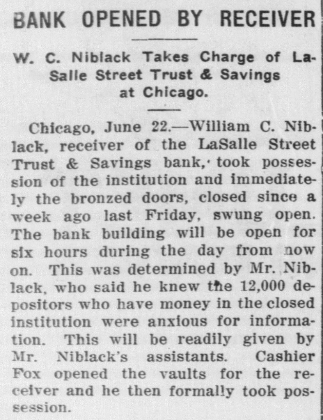 BANK OPENED BY RECEIVER W. C. Niblack Takes Charge of LaSalle Street Trust & Savings at Chicago. Chicago, June 22.-William C. Niblack, receiver of the LaSalle Street Trust & Savings bank,' took possession of the institution and immediately the bronzed doors, closed since a week ago last Friday, swung open. The bank building will be open for six hours during the day from now on. This was determined by Mr. Niblack, who said he knew the 12,000 depositors who have money in the closed institution were anxious for information. This will be readily given by Mr. Niblack's assistants. Cashier Fox opened the vaults for the receiver and he then formally took possession.