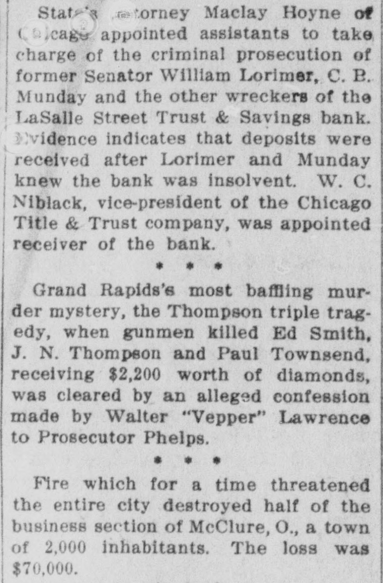 State Attorney Maclay Hoyne of Chicago appointed assistants to take charge of the criminal prosecution of former Senator William Lorimer, C. B. Munday and the other wreckers of the LaSalle Street Trust & Savings bank. Evidence indicates that deposits were received after Lorimer and Munday knew the bank was insolvent. W. C. Niblack, vice-president of the Chicago Title & Trust company, was appointed receiver of the bank.