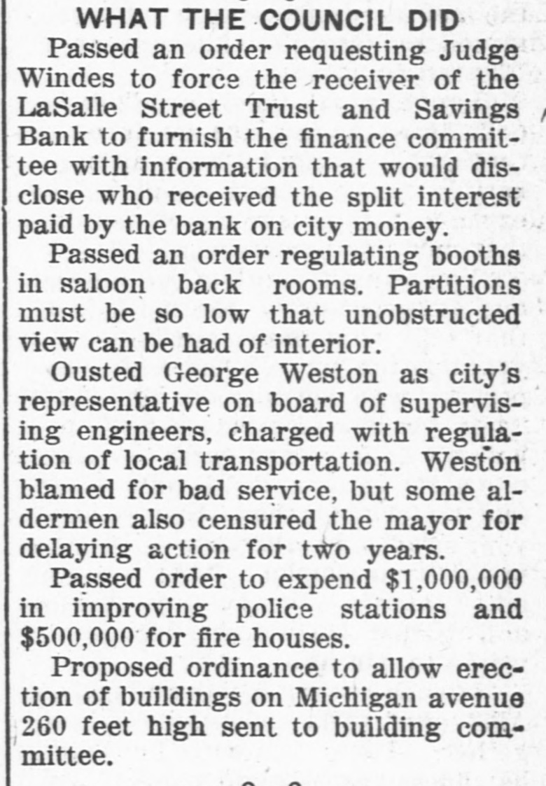 Passed an order requesting Judge Windes to force the receiver of the LaSalle Street Trust and Savings Bank to furnish the finance committee with information that would disclose who received the split interest paid by the bank on city money.