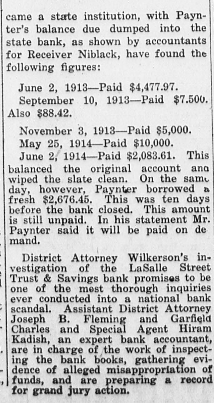 District Attorney Wilkerson's investigation of the LaSalle Street Trust & Savings bank promises to be one of the most thorough inquiries ever conducted into a national bank scandal. Assistant District Attorney Joseph B. Fleming and Garfield Charles and Special Agent Hiram Kadish, an expert bank accountant, are in charge of the work of inspecting the bank books, gathering evidence of alleged misappropriation of funds, and are preparing a record for grand jury action.