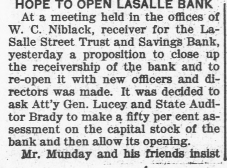 HOPE TO OPEN LASALLE BANK At a meeting held in the offices of W. C. Niblack, receiver for the LaSalle Street Trust and Savings Bank, yesterday a proposition to close up the receivership of the bank and to re-open it with new officers and directors was made. It was decided to ask Att'y Gen. Lucey and State Auditor Brady to make a fifty per cent assessment on the capital stock of the bank and then allow its opening. Mr. Munday and his friends insist