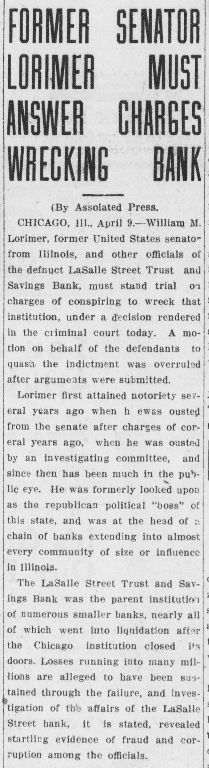 FORMER SENATOR LORIMER MUST ANSWER CHARGES BANK WRECKING (By Assoiated Press. CHICAGO, III., April 9.-William M. Lorimer, former United States senator from Ililnois, and other officials of the defnuct LaSalle Street Trust and Savings Bank, must stand trial on charges of conspiring to wreck that institution, under a d'ecision rendered in the criminal court today. A motion on behalf of the defendants to quash the indictment was overruled after arguments were submitted. Lorimer first attained notoriety several years ago when h ewas ousted from the senate after charges of coreral years ago, when he was ousted by an investigating committee, and since then has been much in the public eye. He was formerly looked upon as the republican political "boss" of this state, and was at the head of 2. chain of banks extending into almost every community of size or influence in Illinois. The LaSalle Street Trust and Savings Bank was the parent institution of numerous smaller banks, nearly all of which went into liquidation after the Chicago institution closed its doors. Losses running into many millions are alleged to have been sustained through the failure, and investigation of the affairs of the LaSalle Street bank, it is stated, revealed startling evidence of fraud and corruption among the officials.