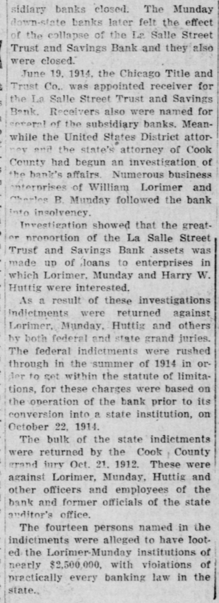 sidiary banks closed. The Munday down-state banks later felt the effect of the collapse of the La Salle Street Trust and Savings Bank and they also were closed. June 19, 1914, the Chicago Title and Trust Co., was appointed receiver for the La Salle Street Trust and Savings Bank. Receivers also were named for central of the subsidiary banks. Meanwhile the United States District attorney and the state's attorney of Cook County had begun an investigation of the bank's affairs. Numerous business enterprises of William Lorimer and Charles B. Munday followed the bank into insolvency. Investigation showed that the greator proportion of the La Salle Street Trust and Savings Bank assets was made un of loans to enterprises in which Lorimer, Munday and Harry W. Huttig were interested. As a result of these investigations indictments were returned against Lorimer, Munday, Huttig and others by both federal and state grand juries. The federal indictments were rushed through in the 'summer of 1914 in order to get within the statute of limitations, for these charges were based on the operation of the bank prior to its conversion into a state institution, on October 22, 1914. The bulk of the state indictments were returned by the Cook I County grand jury Oct. 21. 1912. These were against Lorimer, Munday, Huttig and other officers and employees of the bank and former officials of the state auditor's office. The fourteen persons named in the indictments were alleged to have loot. ed the Lorimer-Munday institutions of nearly $2,500,000, with violations of practically every banking law in the state.