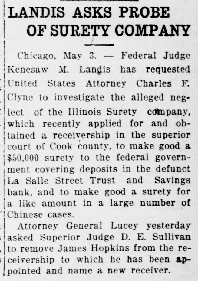 LANDIS ASKS PROBE OF SURETY COMPANY Chicago, May 3. --- Federal Judge Kenesaw M. Landis has requested United States Attorney Charles F. Clyne to investigate the alleged neglect of the Illinois Surety company, which recently applied for and obtained a receivership in the superior court of Cook county, to make good a $50,000 surety to the federal government covering deposits in the defunct La Salle Street Trust and Savings bank, and to make good a surety for a like amount in a large number of Chinese cases. Attorney General Lucey yesterday asked Superior Judge D. E. Sullivan to remove James Hopkins from the receivership to which he has been appointed and name a new receiver.
