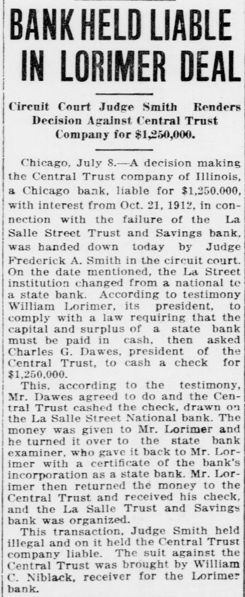 Chicago, July 8.—A decision making the Central Trust company of Illinois, a Chicago bank, liable for $1,250.000, with interest from Oct. 21, 1912, in connection with the failure of the La Salle Street Trust and Savings bank, was handed down today by Judge Frederick A. Smith in the circuit court. On the date mentioned, the La Street institution changed from a national to a state bank. According to testimony William Lorimer, its president, to comply with a law requiring that the capital and surplus of a state bank must be paid in cash, then asked Charles G. Dawes, president of the Central Trust, to cash a check for $1,250,000.