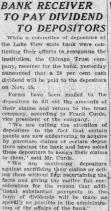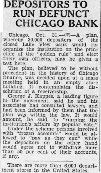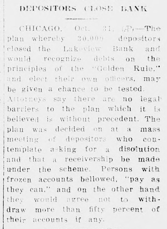 Whereas the decline of the real estate was formerly* the outstanding of the banks. the depletion of cash resources through heavy for now the that if peril. all cash being hoarded in American cities back into the were banks tomorrow, failures would of the individual tables disclosed the of large and small accounts. shore suburban for had twice the centage of large depositors as bank in the south side colored Tables few banks typifying conditions as whole are presented with. The City State bank of in the and closed on Nov. 1929, with account conditions as follows: $1 to $100 accounts 3,135 to $5,000 accounts $5,000 to $10,000 accounts accounts 22,097 deposits Savings Savings clubs. 102,686 Total $166.41 The Lake View State serving well and commercial district at 3179 North Clark street, closed on Sept. 1930: $1 24,032 accounts 7,664 to $5,000 1,089 $5,000 to $10,000 accounts Total accounts. 32,870 deposits $1 Savings Savings elubs 131,913 Total deposits $183.45 The Binga State bank, the trict at South State street, on July 31, $100 16,274 2,048 to $5,000 to $10,000 accounts over $10,000 Total accounts. 18,492 770 Total deposits deposit. $66 Glencoe State in the suburb closed on 23, 1931 $100 accounts 2,864 1,077 accounts 93 to Total accounts 4,037 10,773 Total deposits $620,396 deposit $153.67 Depositors of the Lake View State bank will receive representing per cent of deposits, as the result of an entered yesterday by Circuit Joseph Burke. The bank ceiver, William has pre viously paid a per cent dividend.