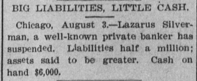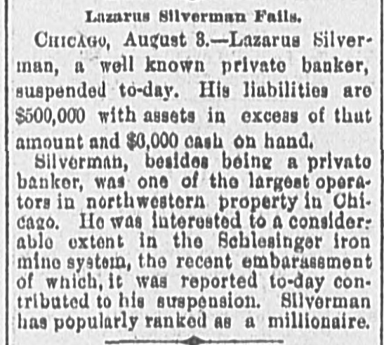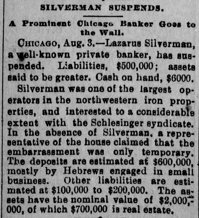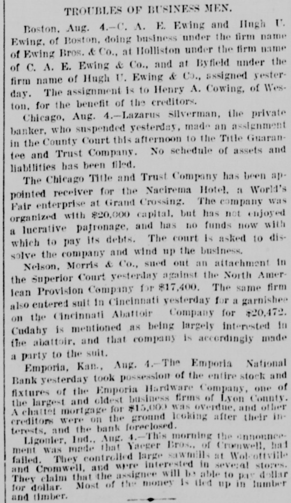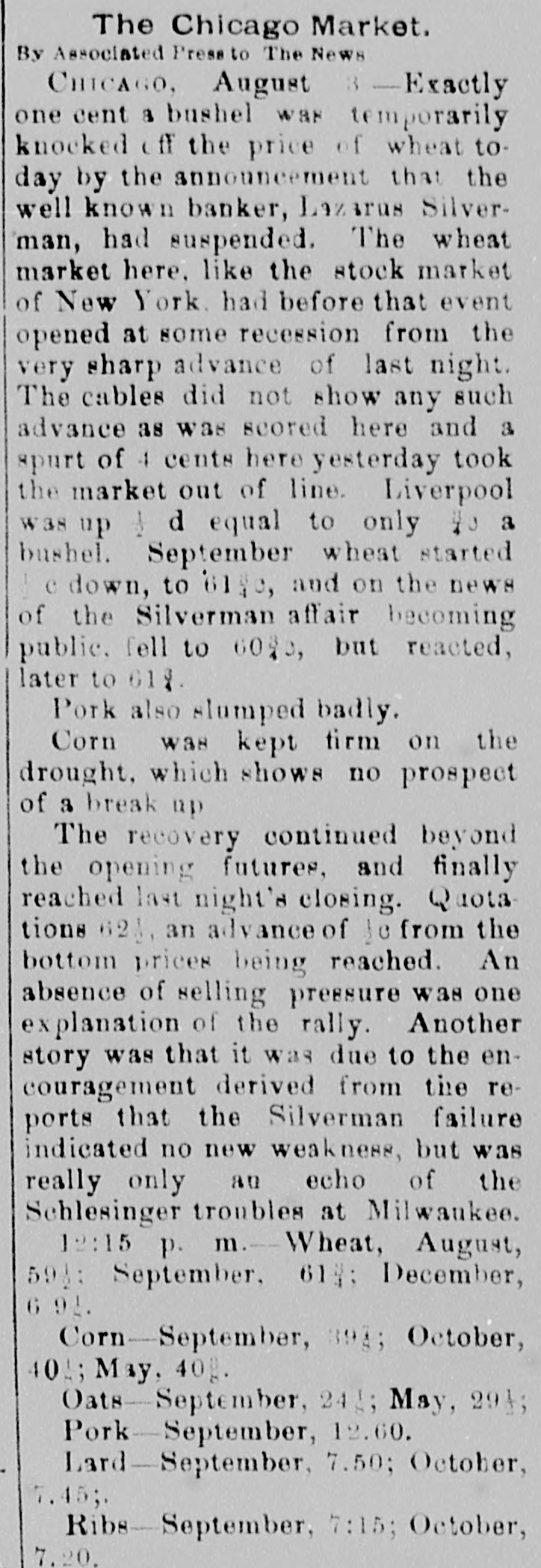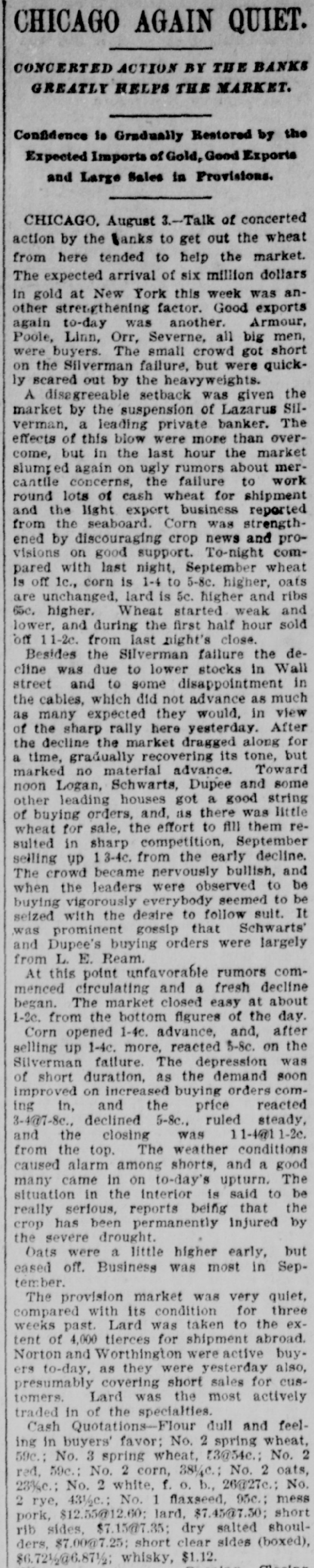 CHICAGO AGAIN QUIET. CONCERTED ACTION BY THE BANKS GREATLY HELPS THE MARKET. Confidence is Gradually Restored by the Expected Imports of Gold, Good Exports and Large Sales in Provisions. CHICAGO, August 3.-Talk of concerted action by the tanks to get out the wheat from here tended to help the market. The expected arrival of six million dollars In gold at New York this week was another strengthening factor. Good exports again to-day was another. Armour, Poole, Linn, Orr, Severne, all big men, were buyers. The small crowd got short on the Silverman failure, but were quickly scared out by the heavyweights. A disagreeable setback was given the market by the suspension of Lazarus Silverman, a leading private banker. The effects of this blow were more than overcome, but in the last hour the market slumped again on ugly rumors about mercantile concerns, the failure to work round lots of cash wheat for shipment and the light export business reported from the seaboard. Corn was strengthened by discouraging crop news and provisions on good support. To-night compared with last night, September wheat is off 1c., corn is 1-4 to 5-8c. higher, oats are unchanged, lard is 5c. higher and ribs 65c. higher. Wheat started weak and lower, and during the first half hour sold off 11-2c. from last night's close. Besides the Silverman failure the decline was due to lower stocks in Wall street and to some disappointment in the cables, which did not advance as much as many expected they would, in view of the sharp rally here yesterday. After the decline the market dragged along for a time, gradually recovering its tone, but marked no material advance. Toward noon Logan, Schwarts, Dupee and some other leading houses got a good string of buying orders, and, as there was little wheat for sale, the effort to fill them resulted in sharp competition, September selling up 1 3-4c. from the early decline. The crowd became nervously bullish, and when the leaders were observed to be buying vigorously everybody seemed to be seized with the desire to follow suit. It was prominent gossip that Schwarts' and Dupee's buying orders were largely from L. E. Ream. At this point unfavorable rumors commenced circulating and a fresh decline began. The market closed easy at about 1-2c. from the bottom figures of the day. Corn opened 1-4c. advance, and, after selling up 1-4c. more, reacted 5-8c. on the Silverman failure. The depression was of short duration, as the demand soon improved on increased buying orders coming in, and the price reacted 3-4@7-8c., declined 5-8c., ruled steady, and the closing was 11-4@1 1-2c. from the top. The weather conditions caused alarm among shorts, and a good many came in on to-day's upturn. The situation in the interior is said to be really serious, reports being that the crop has been permanently injured by the severe drought. Oats were a little higher early, but eased off. Business was most in September. The provision market was very quiet, compared with its condition for three weeks past. Lard was taken to the extent of 4,000 tierces for shipment abroad. Norton and Worthington were active buyers to-day, as they were yesterday also, presumably covering short sales for customers. Lard was the most actively traded in of the specialties. Cash Quotations-Flour dull and feeling in buyers' favor; No. 2 spring wheat, 59c.; No. 3 spring wheat, t3@54c.; No. 2 red, 59c.: No. 2 corn, 381/4c.; No. 2 oats, 23%c.; No. 2 white, f. 0, b., 26@27c.: No. 2 rye, 431/2c.; No. 1 flaxseed, 95c.; mess pork, $12.55@12.60; lard, $7.45@7.50; short rib sides, $7.15@7.35; dry salted shoulders, $7,00@7.25; short clear sides (boxed), $6.72%@6,87%; whisky, $1.12.