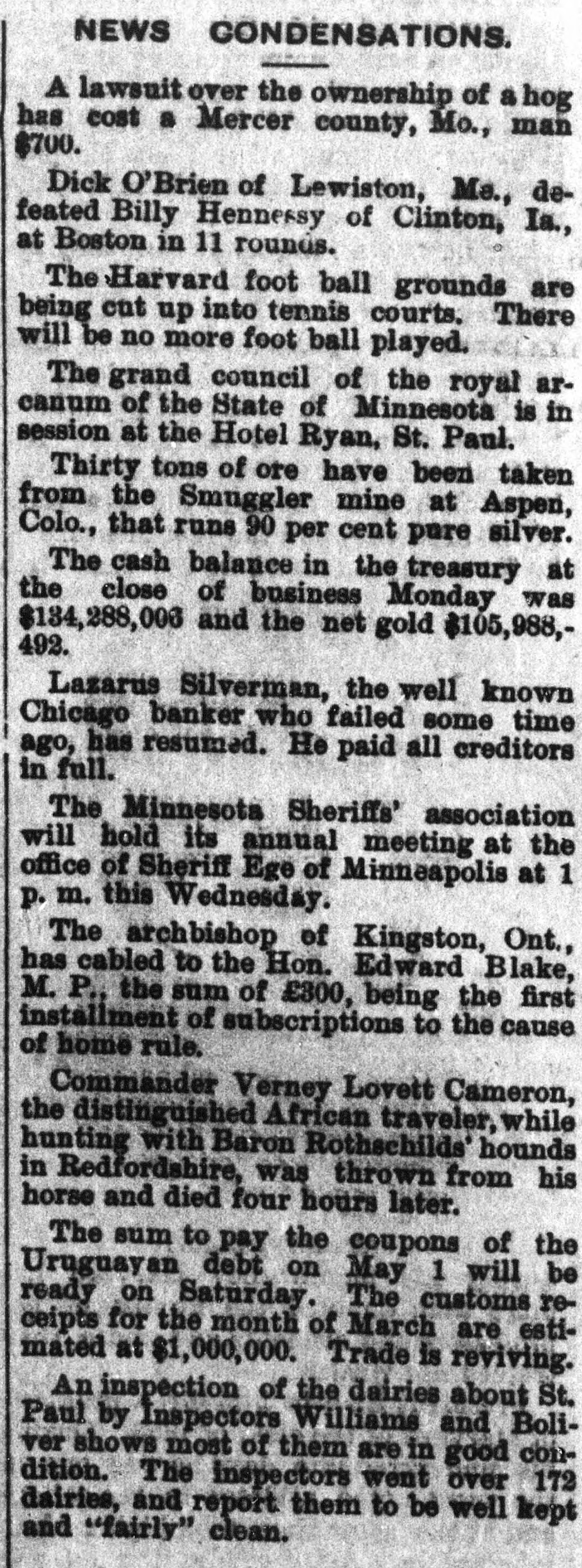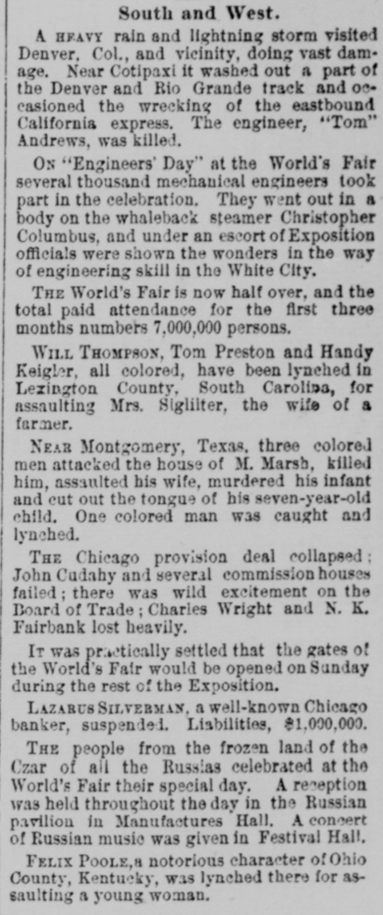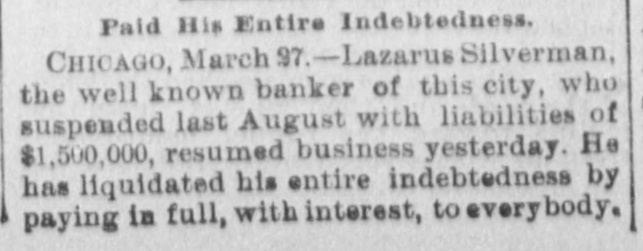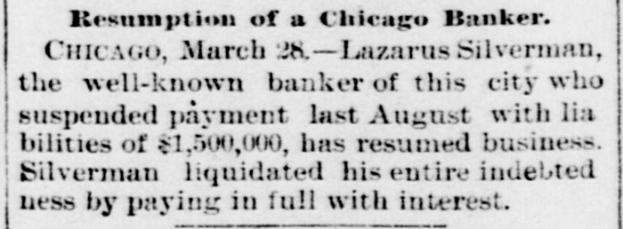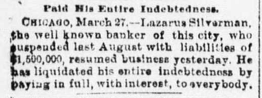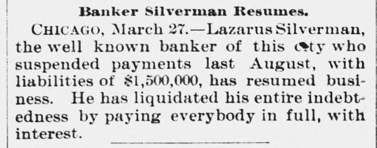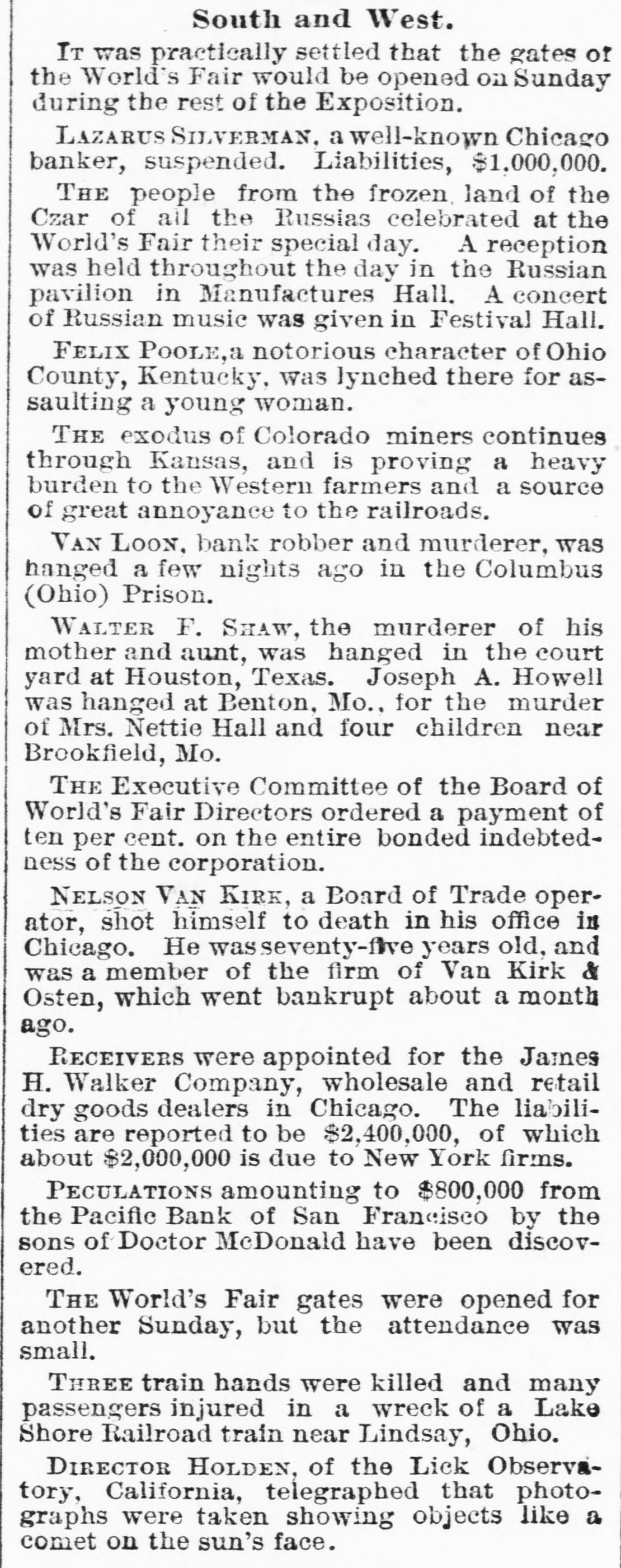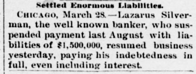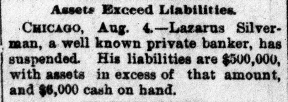 CHICAGO AGAIN QUIET. CONCERTED ACTION BY THE BANKS GREATLY HELPS THE MARKET. Confidence is Gradually Restored by the Expected Imports of Gold, Good Exports and Large Sales in Provisions. CHICAGO, August 3.-Talk of concerted action by the tanks to get out the wheat from here tended to help the market. The expected arrival of six million dollars In gold at New York this week was another strengthening factor. Good exports again to-day was another. Armour, Poole, Linn, Orr, Severne, all big men, were buyers. The small crowd got short on the Silverman failure, but were quickly scared out by the heavyweights. A disagreeable setback was given the market by the suspension of Lazarus Silverman, a leading private banker. The effects of this blow were more than overcome, but in the last hour the market slumped again on ugly rumors about mercantile concerns, the failure to work round lots of cash wheat for shipment and the light export business reported from the seaboard. Corn was strengthened by discouraging crop news and provisions on good support. To-night compared with last night, September wheat is off 1c., corn is 1-4 to 5-8c. higher, oats are unchanged, lard is 5c. higher and ribs 65c. higher. Wheat started weak and lower, and during the first half hour sold off 11-2c. from last night's close. Besides the Silverman failure the decline was due to lower stocks in Wall street and to some disappointment in the cables, which did not advance as much as many expected they would, in view of the sharp rally here yesterday. After the decline the market dragged along for a time, gradually recovering its tone, but marked no material advance. Toward noon Logan, Schwarts, Dupee and some other leading houses got a good string of buying orders, and, as there was little wheat for sale, the effort to fill them resulted in sharp competition, September selling up 1 3-4c. from the early decline. The crowd became nervously bullish, and when the leaders were observed to be buying vigorously everybody seemed to be seized with the desire to follow suit. It was prominent gossip that Schwarts' and Dupee's buying orders were largely from L. E. Ream. At this point unfavorable rumors commenced circulating and a fresh decline began. The market closed easy at about 1-2c. from the bottom figures of the day. Corn opened 1-4c. advance, and, after selling up 1-4c. more, reacted 5-8c. on the Silverman failure. The depression was of short duration, as the demand soon improved on increased buying orders coming in, and the price reacted 3-4@7-8c., declined 5-8c., ruled steady, and the closing was 11-4@1 1-2c. from the top. The weather conditions caused alarm among shorts, and a good many came in on to-day's upturn. The situation in the interior is said to be really serious, reports being that the crop has been permanently injured by the severe drought. Oats were a little higher early, but eased off. Business was most in September. The provision market was very quiet, compared with its condition for three weeks past. Lard was taken to the extent of 4,000 tierces for shipment abroad. Norton and Worthington were active buyers to-day, as they were yesterday also, presumably covering short sales for customers. Lard was the most actively traded in of the specialties. Cash Quotations-Flour dull and feeling in buyers' favor; No. 2 spring wheat, 59c.; No. 3 spring wheat, t3@54c.; No. 2 red, 59c.: No. 2 corn, 381/4c.; No. 2 oats, 23%c.; No. 2 white, f. 0, b., 26@27c.: No. 2 rye, 431/2c.; No. 1 flaxseed, 95c.; mess pork, $12.55@12.60; lard, $7.45@7.50; short rib sides, $7.15@7.35; dry salted shoulders, $7,00@7.25; short clear sides (boxed), $6.72%@6,87%; whisky, $1.12.