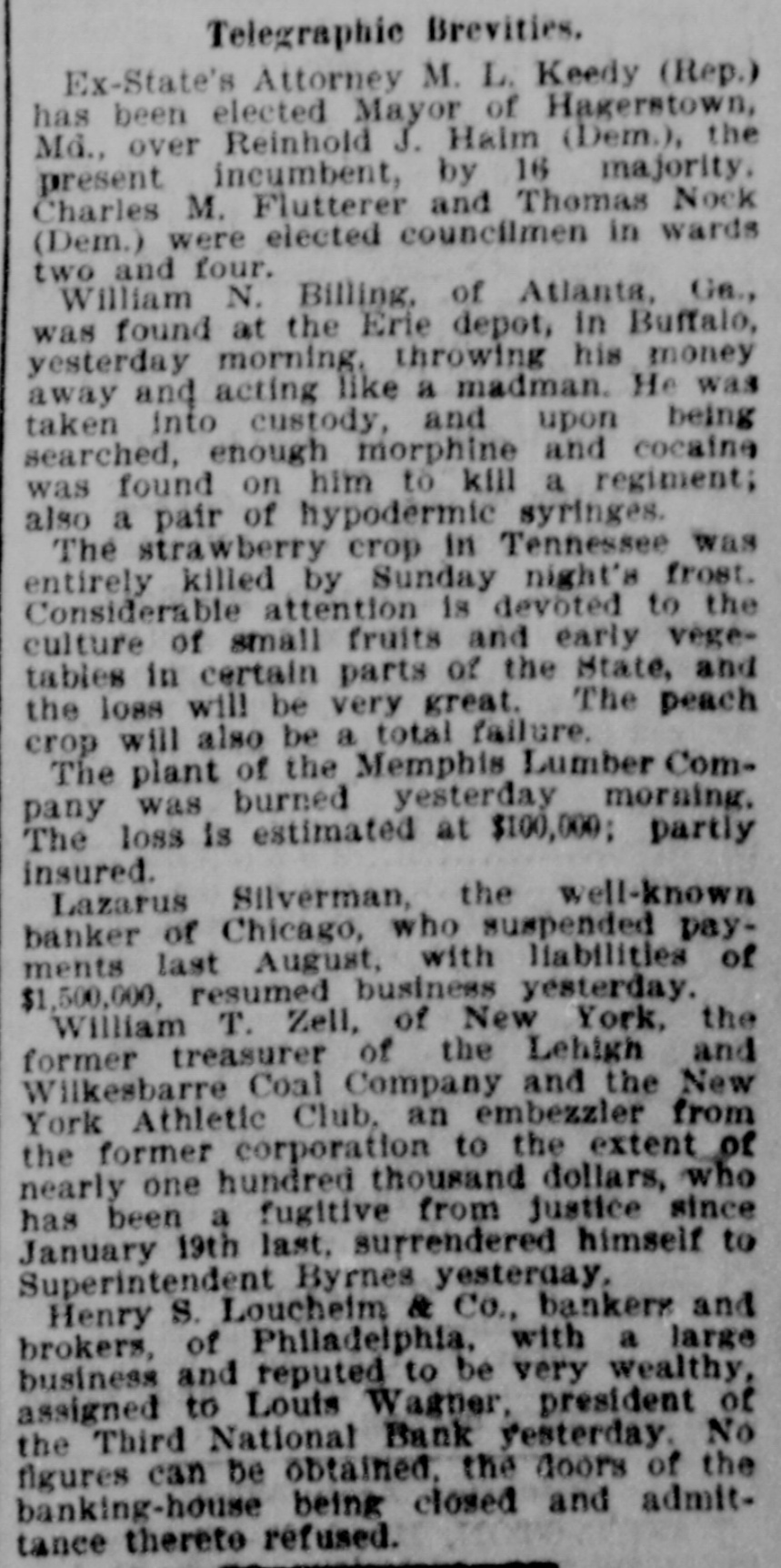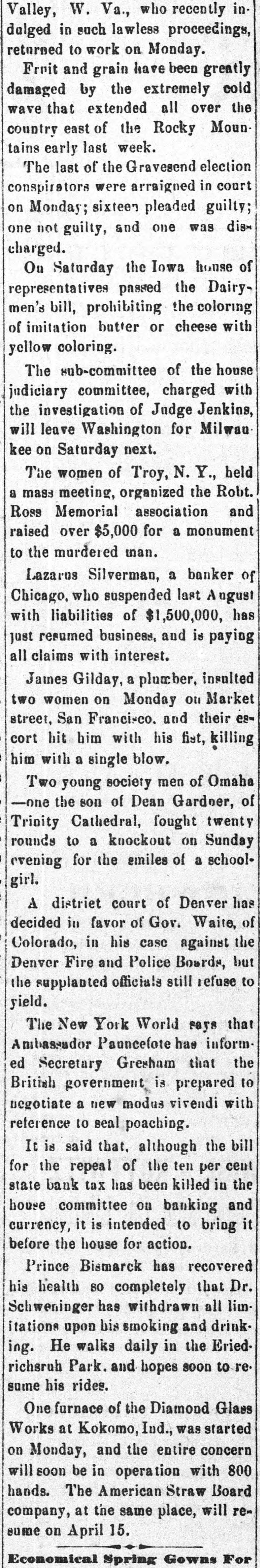 Valley, W. Va., who recently indalged in such lawless proceedings, returned to work on Monday. Fruit and grain have been greatly damaged by the extremely cold wave that extended all over the country east of the Rocky Mountains early last week. The last of the Gravesend election conspirators were arraigned in court on Monday; sixteen pleaded guilty; one not guilty, and one was discharged. On Saturday the Iowa house of representatives passed the Dairymen's bill, prohibiting the coloring of imitation butter or cheese with yellow coloring. The sub-committee of the house judiciary committee, charged with the investigation of Judge Jenkins, will leave Washington for Milwau kee on Saturday next. The women of Troy, N. Y., held a mass meeting, organized the Robt. Ross Memorial association and raised over $5,000 for a monument to the murdered man. Lazarus Silverman, a banker of Chicago, who suspended last August with liabilities of $1,500,000, has just resumed business, and is paying all claims with interest. James Gilday, a plumber, insulted two women on Monday On Market street, San Francisco. and their escort hit him with his fist, killing him with a single blow. Two young society men of Omaha -one the son of Dean Gardoer, of Trinity Cathedral, fought twenty rounds to a knockout on Sunday evening for the smiles of a schoolgirl. A distriet court of Denver has decided in favor of Gov. Waite, of Colorado, in his case against the Denver Fire and Police Boards, but the supplanted officials still refuse to yield. The New York World says that Ambassador Panncefote has informed Secretary Gresham that the British government is prepared to negotiate a new modus virendi with reference to seal poaching. It is said that, although the bill for the repeal of the ten per cent state bank tax has been killed in the house committee on banking and currency, it is intended to bring it before the house for action. Prince Bismarck has recovered his health so completely that Dr. Schweninger has withdrawn all limitations upon bis smoking and drinking. He walks daily in the Eried. richsruh Park. and hopes soon to re. sume his rides. One furnace of the Diamond Glass Works at Kokomo, Ind., was started on Monday, and the entire concern will soon be in operation with 800 hands. The American Straw Board company, at the same place, will resume on April 15. Economical Spring Gowns For
