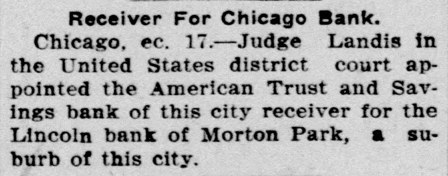 Receiver For Chicago Bank. Chicago, ec. 17.-Judge Landis in the United States district court appointed the American Trust and Savings bank of this city receiver for the Lincoln bank of Morton Park, a suburb of this city.