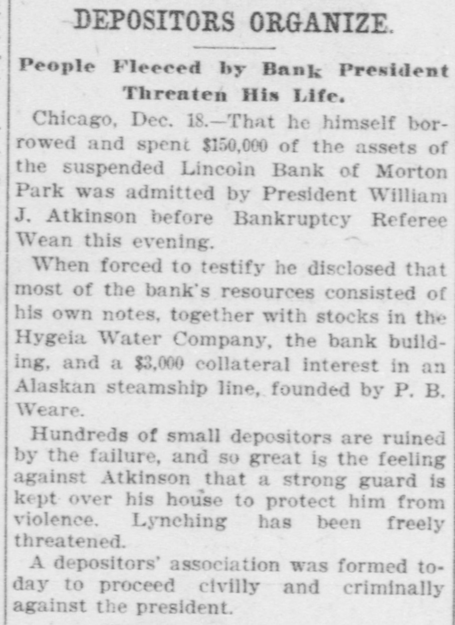 DEPOSITORS ORGANIZE. People Fleeced by Bank President Threaten His Life. Chicago, Dec. 18.-That he himself borrowed and spent $150,000 of the assets of the suspended Lincoln Bank of Morton Park was admitted by President William J. Atkinson before Bankruptcy Referee Wean this evening. When forced to testify he disclosed that most of the bank's resources consisted of his own notes, together with stocks in the Hygeia Water Company, the bank building, and a $3,000 collateral interest in an Alaskan steamship line, founded by P. B. Weare. Hundreds of small depositors are ruined by the failure, and so great is the feeling against Atkinson that a strong guard is kept over his house to protect him from violence. Lynching has been freely threatened. A depositors' association was formed today to proceed civilly and criminally against the president.