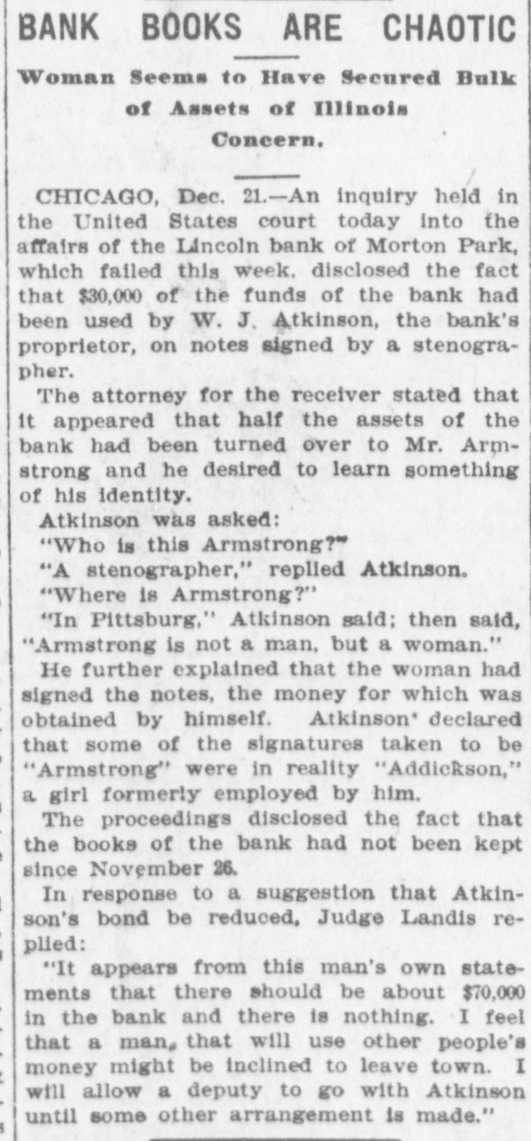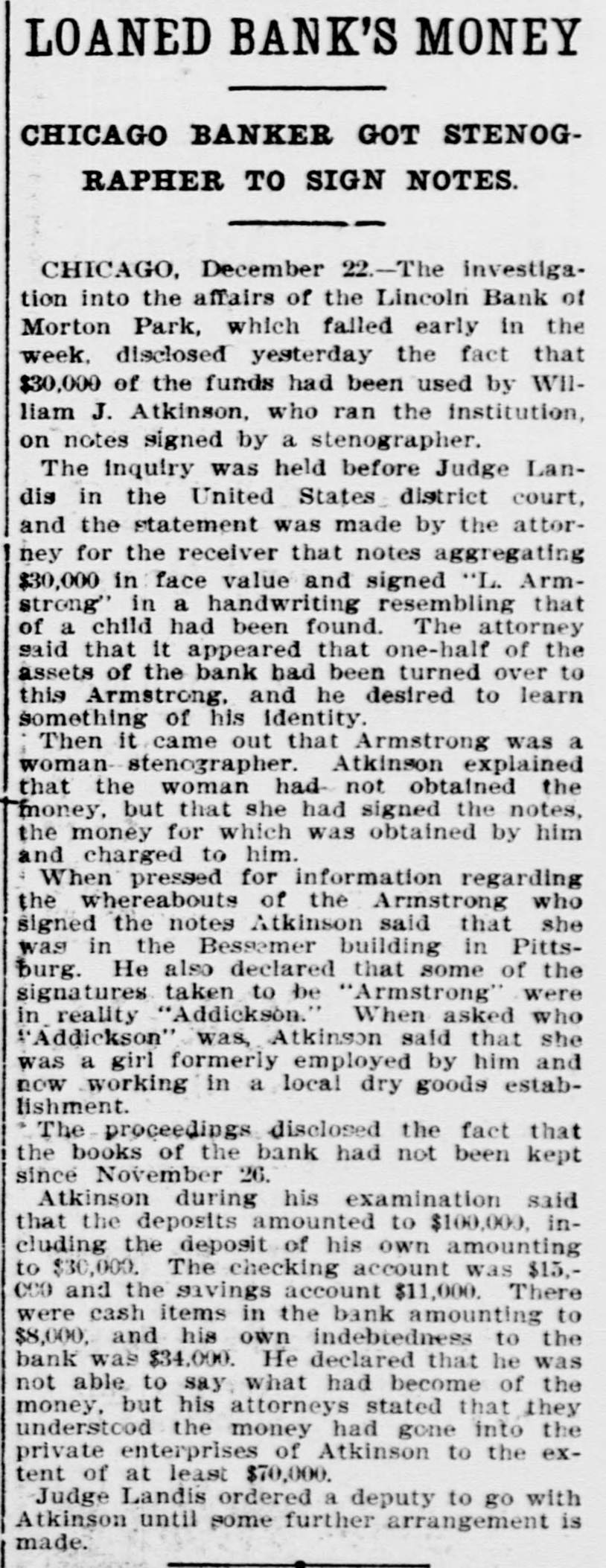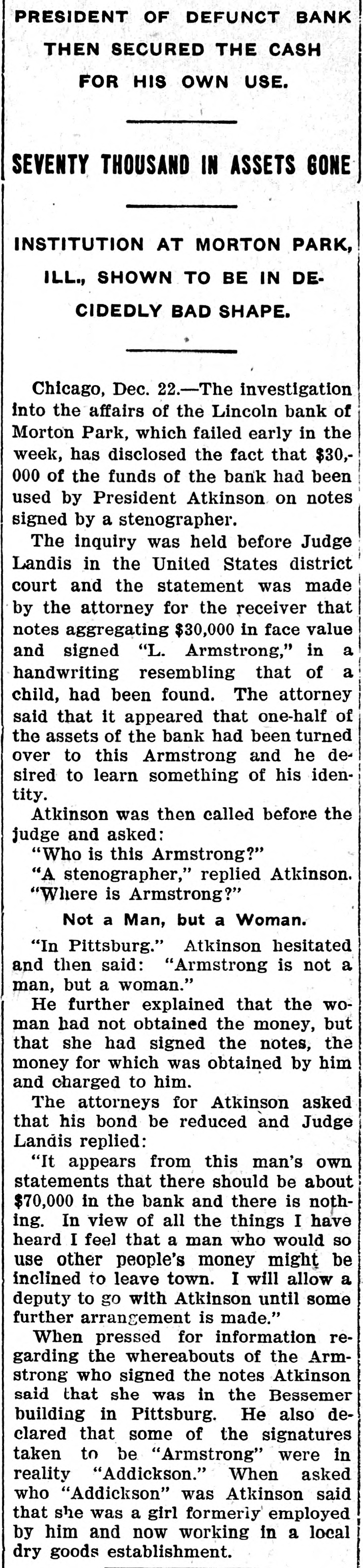 PRESIDENT OF DEFUNCT BANK THEN SECURED THE CASH FOR HIS OWN USE. SEVENTY THOUSAND IN ASSETS GONE INSTITUTION AT MORTON PARK, ILL., SHOWN TO BE IN DECIDEDLY BAD SHAPE. Chicago, Dec. 22.-The investigation into the affairs of the Lincoln bank of Morton Park, which failed early in the week, has disclosed the fact that $30,000 of the funds of the bank had been used by President Atkinson on notes signed by a stenographer. The inquiry was held before Judge Landis in the United States district court and the statement was made by the attorney for the receiver that notes aggregating $30,000 in face value and signed "L. Armstrong," in a handwriting resembling that of a child, had been found. The attorney said that it appeared that one-half of the assets of the bank had been turned over to this Armstrong and he desired to learn something of his identity. Atkinson was then called before the judge and asked: "Who is this Armstrong?" "A stenographer," replied Atkinson. "Where is Armstrong?" Not a Man, but a Woman. "In Pittsburg." Atkinson hesitated and then said: "Armstrong is not a man, but a woman." He further explained that the woman had not obtained the money, but that she had signed the notes, the money for which was obtained by him and charged to him. The attorneys for Atkinson asked that his bond be reduced and Judge Landis replied: "It appears from this man's own statements that there should be about $70,000 in the bank and there is nothing. In view of all the things I have heard I feel that a man who would so use other people's money might be inclined to leave town. I will allow a deputy to go with Atkinson until some further arrangement is made." When pressed for information regarding the whereabouts of the Armstrong who signed the notes Atkinson said that she was in the Bessemer building in Pittsburg. He also declared that some of the signatures taken to be "Armstrong" were in reality "Addickson." When asked who "Addickson" was Atkinson said that she was a girl formerly employed by him and now working in a local dry goods establishment.