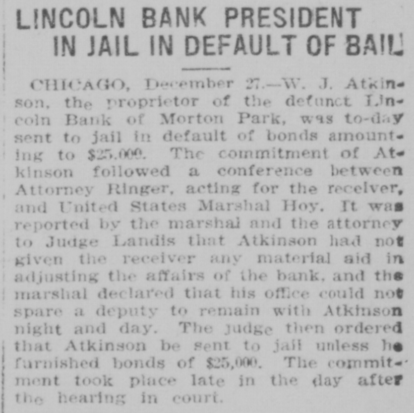 BANKER SENT TO JAIL Proprietor of Defunct Lincoln Bank of Morton Park, Chicago. Chicago, Dec. 27.-W. J. Atkinson, the proprietor of the defunct Lincoln bank of Morton Park, was to-day sent to jail in default of $25,000 bonds, The commitment of Atkinson followed a conference between Attorney Ringer, acting for the receiver, and United States Marshal Hoy. It was reported by the marshal and the attorney, to Judge Landis, that Atkinson had not given the receiver any material aid in adjusting the affairs of th ebank and the marshal declared that his office could not spare a deautar to remain with Atkinson night and day. The judge then ordered that Atkinson be sent to jail unless he furnished bonds of $25,000. The commit ment took place late in the day after the hearing in court.