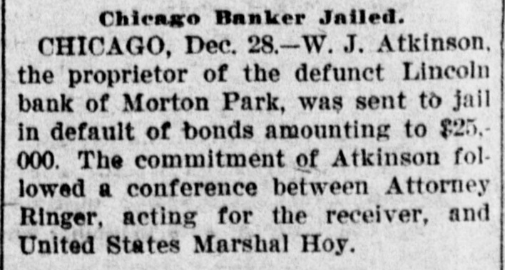 Chicago Banker Jailed. CHICAGO, Dec. 28.-W. J. Atkinson. the proprietor of the defunct Lincoln bank of Morton Park, was sent to jail in default of bonds amounting to $25.000. The commitment of Atkinson followed a conference between Attorney Ringer, acting for the receiver, and United States Marshal Hoy.
