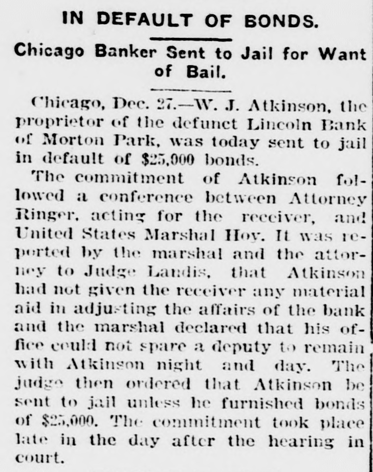 IN default OF BONDS. Chicago Banker Sent to Jail for Want of Bail. Chicago, Dec. 27.-W. J. Atkinson, the proprietor of the defunct Lincoln Bank of Morton Park, was today sent to jail in default of $25,000 bonds. The commitment of Atkinson followed a conference between Attorney Ringer. acting for the receiver, and United States Marshal Hoy. It was reported by the marshal and the attorney to Judge Landis, that Atkinson had not given the receiver any material aid in adjusting the affairs of the bank and the marshal declared that his office could not spare a deputy to remain with Atkinson night and day. The judge then ordered that Atkinson be sent to jail unless he furnished bonds of $25,000. The commitment took place late in the day after the hearing in court.