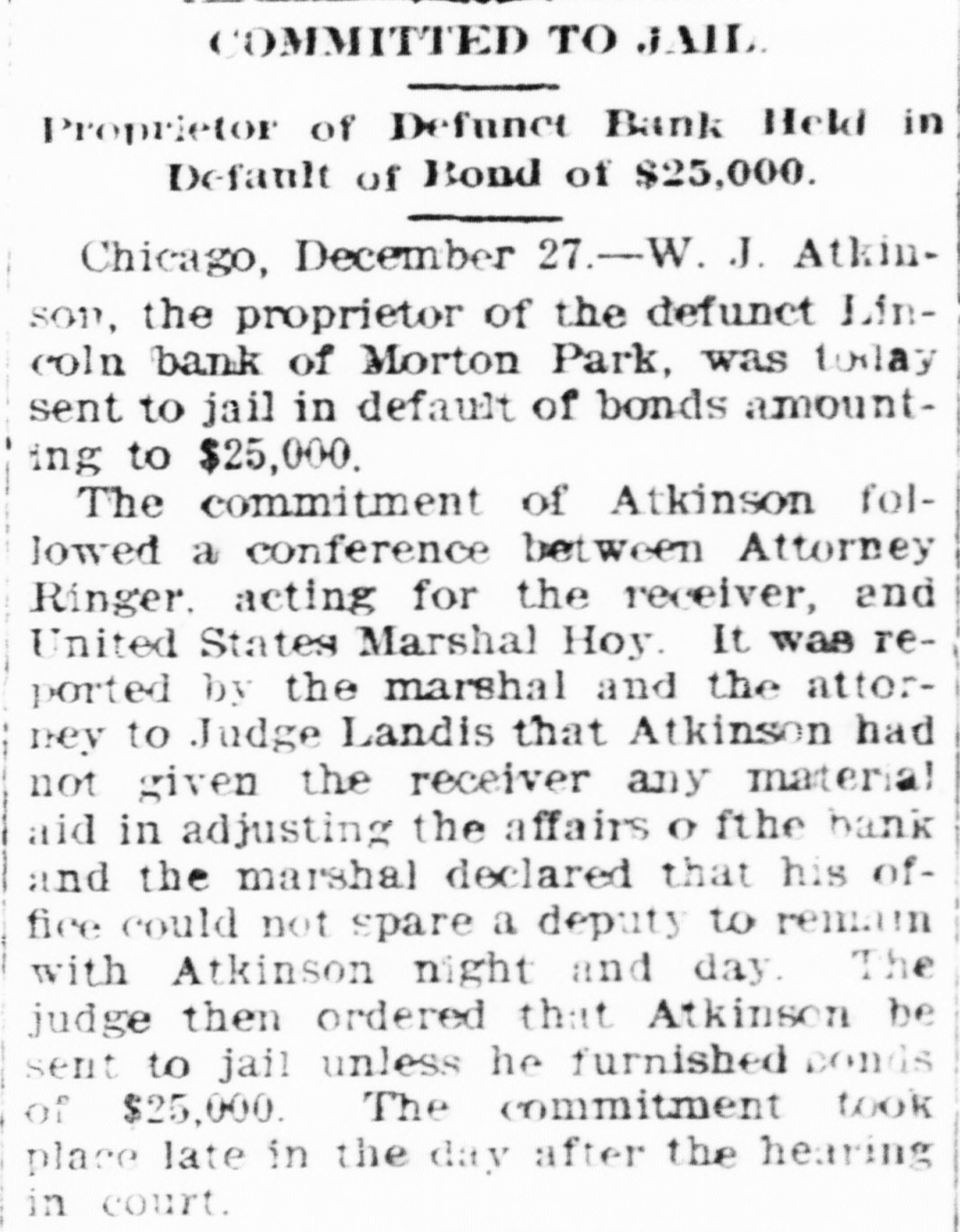 COMMITTED TO JAIL Proprietor of Defunct Bank Held in Default of Bond of $25,000. Chicago, December 27.-W. J. Atkinson, the proprietor of the defunct Lincoln bank of Morton Park, was today sent to jail in default of bonds amounting to $25,000. The commitment of Atkinson followed a conference between Attorney Ringer. acting for the receiver, and United States Marshal Hoy. It was reported by the marshal and the attorney to Judge Landis that Atkinson had not given the receiver any material aid in adjusting the affairs o fthe bank and the marshal declared that his office could not spare a deputy to remain with Atkinson night and day. The judge then ordered that Atkinson be sent to jail unless he furnished conds of $25,000. The commitment took place late in the day after the hearing in court.