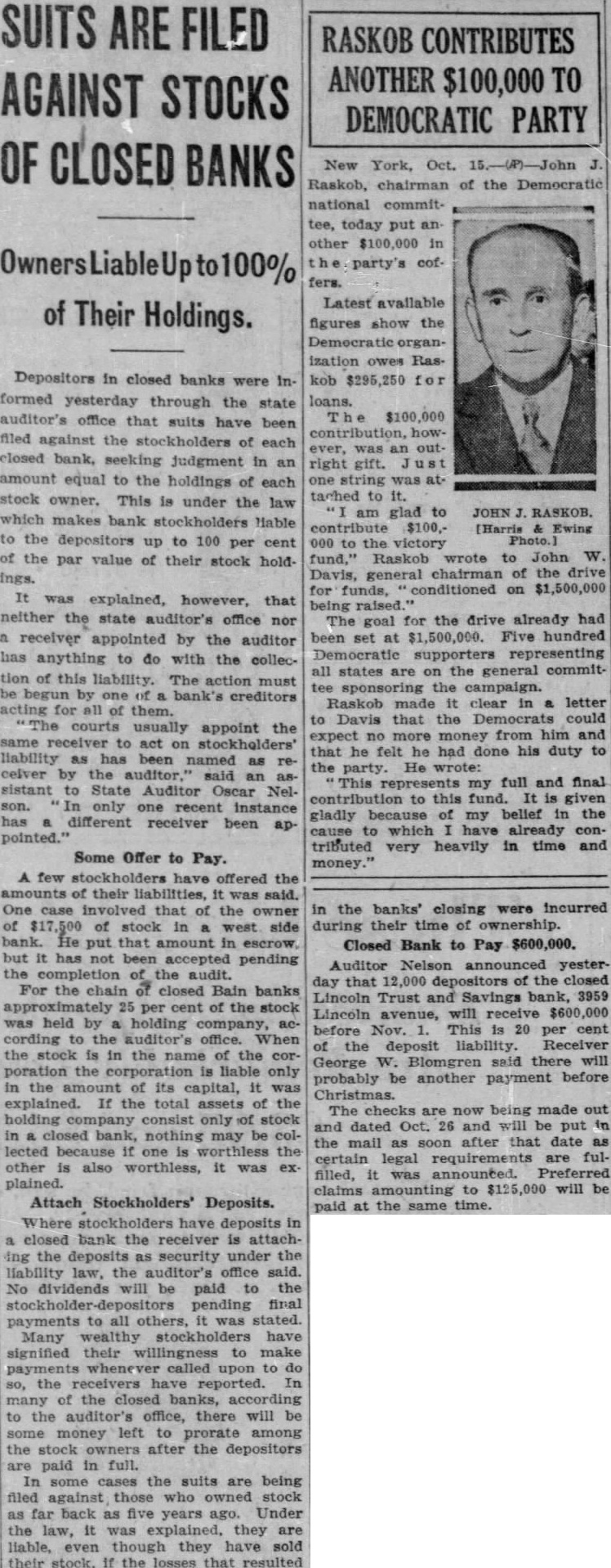 SUITS ARE FILED AGAINST STOCKS OF CLOSED BANKS Owners Liable to 100% of Their Holdings. Depositors in closed banks were Informed yesterday through the state auditor's office that suits have been filed against the stockholders of each closed bank, seeking judgment in an amount equal to the holdings of each stock owner. This is under the law which makes bank stockholders liable to the depositors up to 100 per cent of the par value of their stock holdings. It was explained, however, that neither the state auditor's office nor a receiver appointed by the auditor has anything to do with the collection of this liability. The action must be begun by one of bank's creditors acting for all of them. courts usually appoint the same receiver to act on stockholders' liability as has been named as recelver by the auditor, said an as sistant to State Auditor Oscar Nelson. In only one recent instance has different receiver been appointed." Some Offer to Pay. A few stockholders have offered the amounts of their liabilities, it was said. One case involved that of the owner of $17,500 of stock in west side bank. He put that amount in escrow, but it has not been accepted pending the completion of the audit. For the chain of closed Bain banks approximately 25 per cent of the stock was held by a holding company, according to the auditor's office. When the stock is in the name of the corporation the corporation is liable only in the amount of its capital, it was explained. If the total assets of the holding company consist only of stock in closed bank, nothing may be collected because if one worthless the other is also worthless, it was explained. Attach Stockholders' Deposits. Where stockholders have deposits in closed bank the receiver is attaching the deposits as security under the liability law, the auditor's office said. No dividends will be paid to the pending final payments to all others, it was stated. Many wealthy stockholders have signified their willingness to make payments called upon to do so, the receivers have reported. In many of the closed banks, according to the auditor's office, there will be some money left to prorate among the stock owners after the depositors are paid in full. In some cases the suits are being filed against those who owned stock as far back as five years ago. Under the law, it was explained. they are liable, even though they have sold their stock, If the losses that resulted in the banks' closing were incurred during their time of ownership. Closed Bank to Pay $600,000. Auditor Nelson announced yesterday that 12,000 depositors of the closed Lincoln Trust and Savings bank, 3959 Lincoln avenue, will receive $600,000 before Nov. This is 20 per cent of the deposit liability. Receiver George W Blomgren said there will probably be another payment before Christmas. The checks are now being made out and dated Oct. 26 and will be put in the mail as soon after that date as certain legal requirements are fulfilled, it was announced. Preferred claims amounting to $125,000 will be paid at the same time.