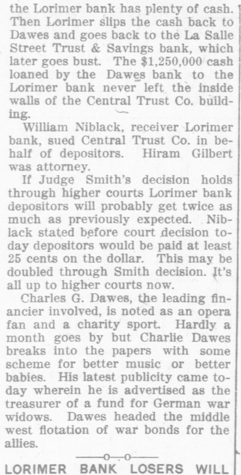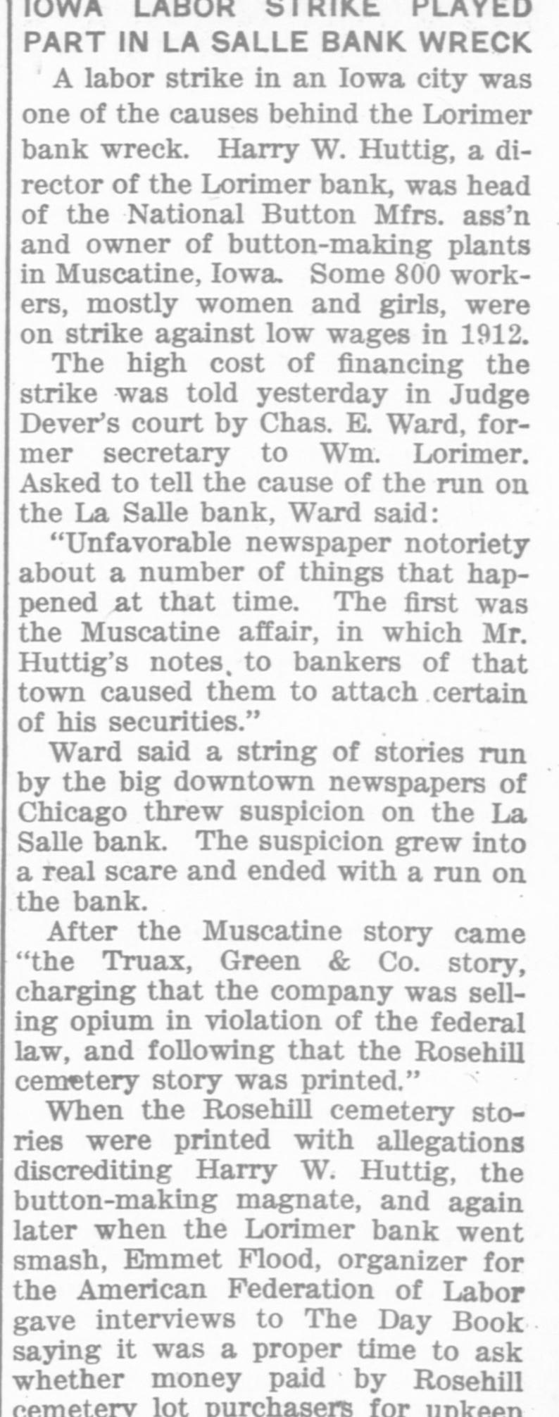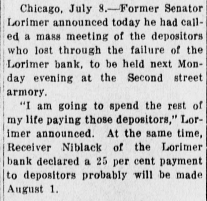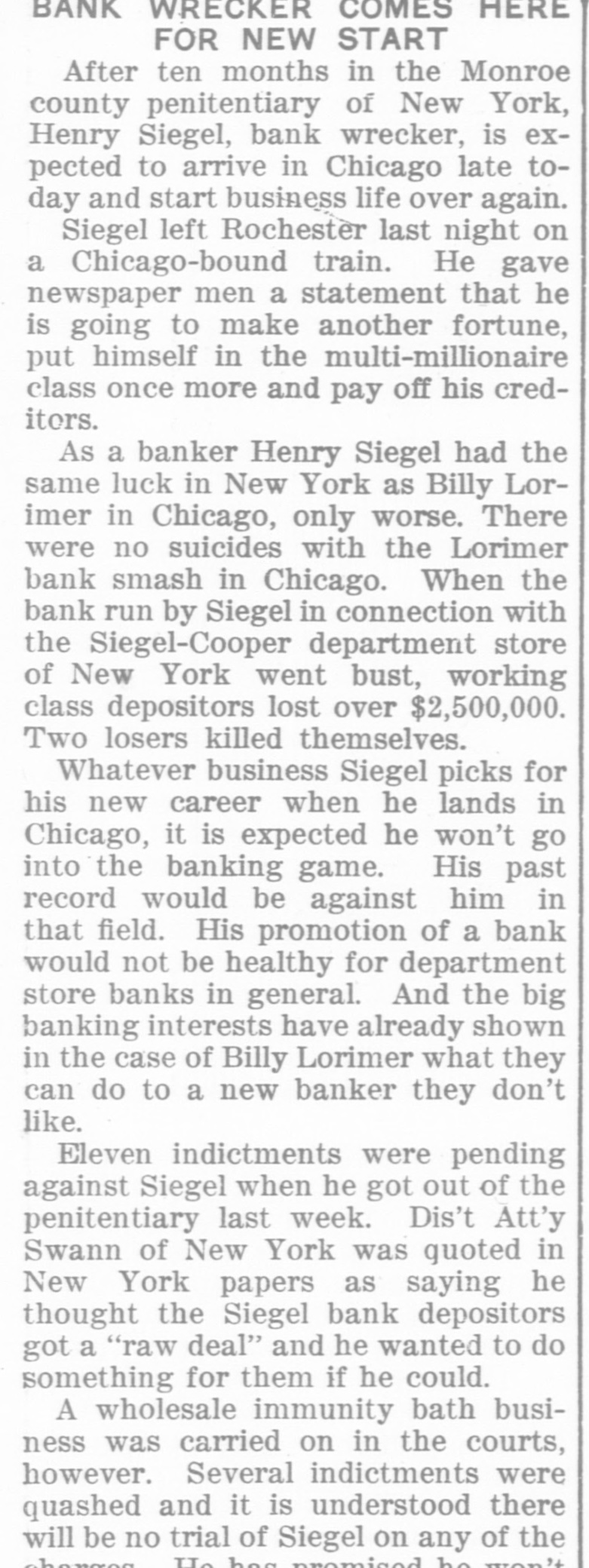 BANK WRECKER COMES HERE FOR NEW START After ten months in the Monroe county penitentiary of New York, Henry Siegel, bank wrecker, is expected to arrive in Chicago late today and start business life over again. Siegel left Rochester last night on a Chicago-bound train. He gave newspaper men a statement that he is going to make another fortune, put himself in the multi-millionaire class once more and pay off his creditors. As a banker Henry Siegel had the same luck in New York as Billy Lorimer in Chicago, only worse. There were no suicides with the Lorimer bank smash in Chicago. When the bank run by Siegel in connection with the Siegel-Cooper department store of New York went bust, working class depositors lost over $2,500,000. Two losers killed themselves. Whatever business Siegel picks for his new career when he lands in Chicago, it is expected he won't go into the banking game. His past record would be against him in that field. His promotion of a bank would not be healthy for department store banks in general. And the big banking interests have already shown in the case of Billy Lorimer what they can do to a new banker they don't like. Eleven indictments were pending against Siegel when he got out of the penitentiary last week. Dis't Att'y Swann of New York was quoted in New York papers as saying he thought the Siegel bank depositors got a "raw deal" and he wanted to do something for them if he could. A wholesale immunity bath business was carried on in the courts, however. Several indictments were quashed and it is understood there will be no trial of Siegel on any of the Uā hos nromicad he won't