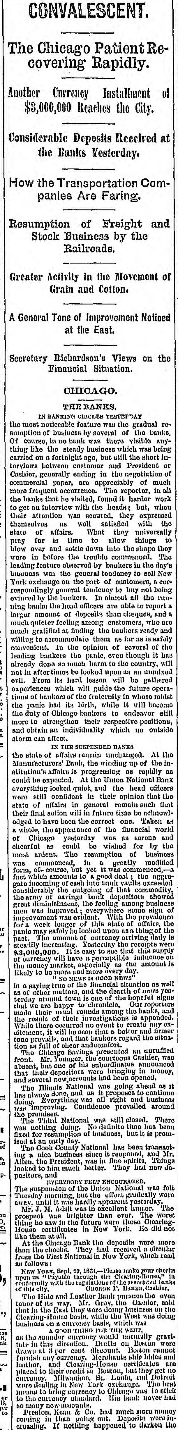 CONVALESCENT. The Chicago Patient Recovering Rapidly. of Another Currency Installment $3,000,000 Reaches the City. Considerable Deposits Received at the Banks Yesterday. How the Transportation Companies Are Faring. Resumption of Freight and Stock Business by the Railroads. Greater Activity in the Movement of Grain and Cotton. A General Tone of Improvement Notioed at the East. Secretary Richardson's Views on the Financial Situation. CHICAGO. THE BANKS. IN BANKING CIRCLES YESTERDAY most noticeable feature WAS the gradual banks, rethe of business by soveral of visible the anysumption in no bank was there being of course, like the steady business which was short inthing on fortnight ago, but still President the or torviows carried botween customer and negotiation of Cashier, generally ending in the of much occurrence. coinmercial paper, are appreciably The reporter, in all more frequent that he visited, found it harder work to the get banks au intorviow with the heads; but, expressed when attention was accured, they with the their as well satisfied thomsolves affairs. What they universally to stato for of is time to allow things shape pray and Bottle down into the they The blow over in before the trouble commenced. the day's the general leading wore feature observed by tondency bankers to in sell Now tendency business York exchange was on the part of customers, to buy not being correspondingly by the general bankora. In almost all the report runevinced banks the head officers are able to and ning amount of deposits than obsques, who are larger quieter feeling among customers, and much gratified nt finding the bankers ready safely opinion much willing to accommodato them of as governal far as in of the convenient. bankers In the the panic, even though country, it has will leading dono so much harm to the unmixed already after timos be looked upon as an gathered not in its hard leason will be evil. From which will guide the future opern- midet exporiences of bankere of the fraternity in whose will become the tions panic had its birth, while it endoavor still duty of Chicago bankers to positions, the strongthen their respective outside and obtain more to an individuality which no storm can affect. IN THE SUSPENDED BANKS state of affairs remain unchanged. of the At the the Manufacturers' Bank, the winding up rapidly in- as stitution's affairs is progressing as National Bank expected. At the Union oflicors could be locked quiet, and the head that the general overything wore still confident in their romain opinion such that state final of affairs action will in in futuro time be Taken acknowltheir to have been the correct one. world edged whole, the appearance of the financial Horono and R Chicago yesterday was ns by the of as could bo wished for business greatly most ohcerful ardent. The rosumption of modified was commenced in vot a was L form, of course, but to good doal the aggrefact which amounts into bank vaults gate incoming the of cash outgoing of that commodity, considerably bank depositors showed the army minishment of savings the feeling among some business sign of great men was improved evident. every With the prevalence the improvement was of this state of Affairs, the panic for a week may safely longer be looked upon as arriving thing of daily is past. The amount of oatorday currency the receipts this rupply were steadly increasing. easy soe that $3,000,000. will It is have perceptible as the influence amount of currency market especially the money be more and moro overy NEWS day likely to NO NEWH financial GOOD situn tion as well is saying true the and the dearth of nows yesas of other matters, town our of the Our eful roportere signs torday around chronicle. that are happy usual rounds to among the banks, apponded. and made their of their invostigations create is any While the osule there occurred no ovent that to better and firmer provails, citament will and be that BOOD baukers regard the situatono full of choor Icomfort. an unrufiled tion The as Chicago Savings the presented courteous Cashier, announce front. absont, Mr. but one of lile were ubordinates bringing in money, that their depositors had been opened. and several now_accounts was going ahead as it The Illinois National proposos to continue always done, and as right and business was improving. doing. has Everything Confidence was all prevailed around the premises. National was still closed. has There been I The Third No dofinite time was fixed nothing for rosumption doing. of business, but is promof deed an early County day. National reopened, has been transact and Mr. ing Tuo Cook nice business since was in fine spirits, now Things dolooked Allen, the to him President, much botter. They had positors, and EVERYBODY FELT ENCOURAGED folt suspension of the Union offent National gradually WAB wore The Tuesday morning but the apparent yosterdity The until was hardly excellent lumor. away, M. Adult was in over. The worst prospect Mr. WAH brighter future than were thoso Clearing- not House thing he certificates BLW in the in Now York. Ho did like them at all, Chicago Bank the deposits wore ulroular more At the 'Phoy had received read an than from the the checks. First National in New York, which follows: 29, 1873. Please make your cheake , NEW Yonk, Payable Sept. through the banks upon us, with the reg GUORGE 1' BAKER, Cashier. even of indi city Hide and Leather Bank pursuan Camier, the said The of 14 way. Mr Grov the hueiness ou the , that touor the East they were while doing the West was doing ilouse basis, which who Clearing on currency basis, WEST, gravi1 business good currency THING you would THE naturally all the Rounder direction. Drafts on Beston cannot were tate in this cont discount. Boston hides are drawu per Courrency. Morchaute bluip artiluates furnish any Clearing House leather and in Boston, butthoy got placed to their credit St. Louis, and "Datroit . currency Milwaukee, exchange. The beat to the currency means we