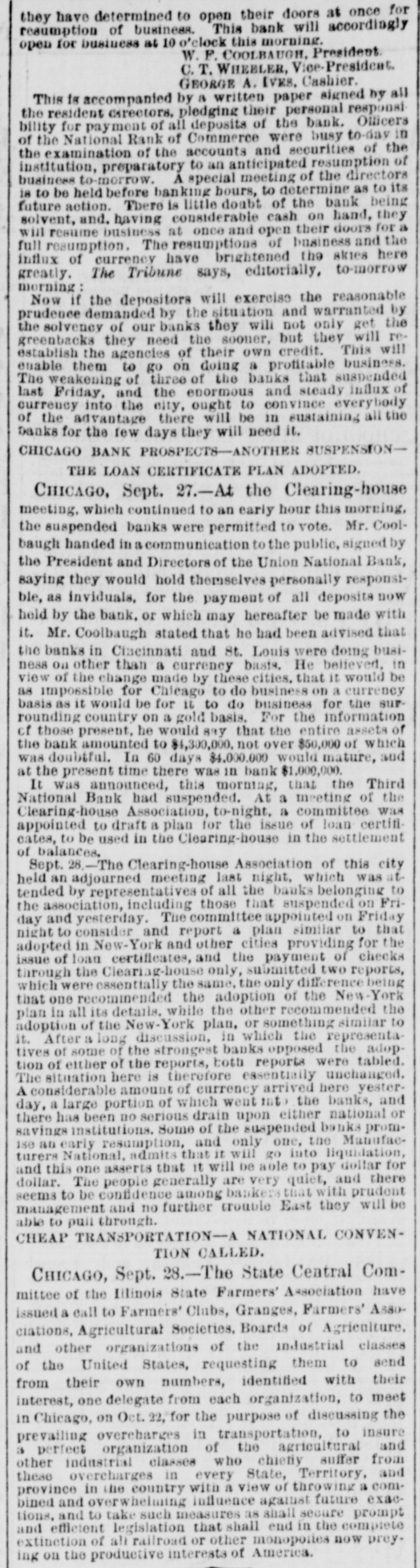 they have determined to open their doors at once for resumption of business. This bank will accordingly open for business at 10 o'clock this morning. W. F. COOLBAUGH, President C. T. WHEELER, Vice-President. GEORGE A. IVES. Cashier. This is accompanied by a written paper signed by all the resident directors, pledging their personal responsibility for payment of all deposits of the bank. Officers of the National Rank of Commerce were busy to-day in the examination of the accounts and securities of the institution, preparatory to an anticipated resumption of business to-morrow. A special meeting of the directors is to be held before banking hours, to determine as to its future action. There is little doubt of the bank being solvent, and. having considerable cash on hand, they will resume business at once and open their doors for a full resumption. The resumptions of business and the influx of currency have brightened the skies here greatly. The Tribune says, editorially, to-morrow morning : Now if the depositors will exercise the reasonable prudence demanded by the situation and warranted by the solvency of our banks they will not only get the greenbacks they need the sooner, but they will reestablish the agencies of their own credit. This will enable them to go on doing a profitable business. The weakening of three of the banks that suspended last Friday, and the enormous and steady influx of currency into the city, ought to convince everybody of the advantage there will be in sustaining all the banks for the few days they will need it. CHICAGO BANK PROSPECTS--ANOTHER SUSPENSIONTHE LOAN CERTIFICATE PLAN ADOPTED. CHICAGO. Sept. 27.-At the Clearing-house meeting, which continued to an early hour this morning, the suspended banks were permitted to vote. Mr. Coolbaugh handed communication to the public, signed by the President and Directors of the Union National Bank, saying they would hold themselves personally responsible, as inviduals, for the payment of all deposits now held by the bank. or which may hereafter be made with it. Mr. Coolbaugh stated that he had been advised that the banks in Ciacinnati and St. Louis were doing business on other than a currency basis. He believed, in view of the change made by these cities. that it would be as impossible for Chicago to do business on a currency basis as it would be for it to do business for the surrounding country on a gold basis. For the information of those present, he would say that the entire assets of the bank amounted to $4,300,000, not over $50,000 of which was doubtful. In 60 days $4,000.000 would mature, and at the present time there was in bank $1,000,000. It was announced, this morning, that the Third National Bank had suspended. At a meeting of the Clearing-house Association, to-night. a committee was appointed to draft a plan for the issue of loan certificates, to be used in the Clearing-house in the settlement of balances. Sept. 8.-The Clearing-house Association of this city held an adjourned meeting last night, which was at tended by representatives of all the banks belonging to the association, including those that suspended on Friday and yesterday. The committee appointed on Friday night to consider and report a plan similar to that adopted in New-York and other cities providing for the issue of loan certificates, and the payment of checks through the Cleariag-house only, submitted two reports, which were essentially the same. the only difference being that one recommended the adoption of the New-York plan in all its details. while the other recommended the adoption of the New-York plan, or something similar to it. After a long discussion, in which the representatives of some of the strongest banks opposed the adoption of either of the reports, both reports were tabled. The situation here is therefore essentially unchanged. A considerable amount of currency arrived here yesterday, a large portion of which went: into the banks, and there has been no serious drain upon either national or savings institutions. Some of the suspended banks prom180 an early resumption, and only one, the Manufacturers National, admits that it will go into liquidation, and this one asserts that it will be aole to pay dollar for dollar. The people generally are very quiet, and there seems to be confidence among bankers that with prudent management and no further crouble East they will be able to pull through. CHEAP TRANSPORTATION-A NATIONAL CONVENTION CALLED. CHICAGO, Sept. 28.-The State Central Committee of the Illinois State Farmers' Association have issued a call to Farmers' Clubs, Granges, Farmers' Associations, Agricultural Societies, Boards of Agrieulture, and other organizations of the industrial classes of the United States, requesting them to send from their own numbers, identified with their interest, one delegate from each organization, to meet in Chicago, on Oct. 22, for the purpose of discussing the prevailing overcharges in transportation, to insure a perfect organization of the agricultural and other industrial classes who chiefiy suffer from these overcharges in every State, Territory, and province in the country with a view or throwing a combined and overwhelming influence against future exactions, and to take such measures as shall secure prompt and efficient legislation that shall end in the complete extinction of all railroad or other monopolies now preying on the productive interests of America.