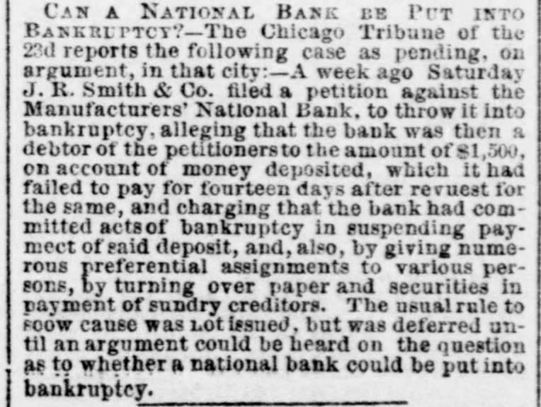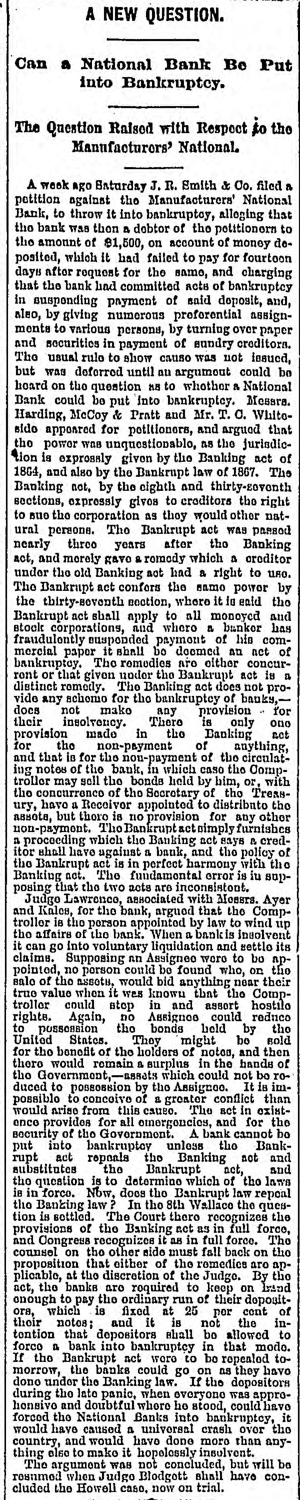 A NEW QUESTION. Can a National Bank Be Put into Bankruptcy. The Question Raised with Respect to the Manufacturers' National. A week ago Saturday J. R. Smith & Co. filed a petition against the Manufacturers' National Bank, to throw it into bankruptcy, alleging that the bank was then a debtor of the petitioners to the amount of $1,500, on account of money deposited, which it had failed to pay for fourteen days after request for the same, and charging that the bank had committed acts of bankruptcy in suspending payment of said deposit, and, also, by giving numerous preferential assignments to various persons, by turning over paper and securities in payment of sundry creditors. The usual rule to show cause was not issued, but was deferred until an argument could be heard on the question as to whether a National Bank could be put into bankruptcy. Messrs. Harding, McCoy & Pratt and Mr. T. C. Whiteside appeared for petitioners, and argued that the power was unquestionable, as the jurisdiction is expressly given by the Banking act of 1864, and also by the Bankrupt law of 1867. The Banking act, by the eighth and thirty-seventh sections, expressly gives to creditors the right to sue the corporation as they would other natural persons. The Bankrupt act was passed nearly three years after the Banking act, and merely gave a remedy which a creditor under the old Banking act had a right to use. The Bankrupt act confers the same power by the thirty-seventh section, where it is said the Bankrupt act shall apply to all moneyed and stock corporations, and where a banker has fraudulently suspended payment of his commercial paper it shall be deemed an act of bankruptcy. The remedies are either concurrent or that given under the Bankrupt act is a distinct remedy. The Banking act does not provide any scheme for the bankruptcy of banks, does not make any provision for their insolvency. There is only one provision made in the Banking act for the non-payment of anything, and that is for the non-payment of the circulating notes of the bank, in which case the Comptroller may sell the bonds held by him, or, with the concurrence of the Secretary of the Treasury, have a Receiver appointed to distribute the assets, but there is no provision for any other non-payment. The Bankrupt act simply furnishes a proceeding which the Banking act says a creditor shall have against a bank, and the policy of the Bankrupt act is in perfect harmony with the Banking act. The fundamental error is in supposing that the two acts are inconsistent. Judge Lawrence, associated with Messrs. Ayer and Kales, for the bank, argued that the Comptroller is the person appointed by law to wind up the affairs of the bank. When a bank is insolvent it can go into voluntary liquidation and settle its claims. Supposing an Assignee were to be appointed, no person could be found who, on the sale of the assets, would bid anything near their true value when it was known that the Comptroller could stop in and assert hostile rights. Again, no Assignee could reduce to possession the bonds held by the United States. They might be sold for the benefit of the holders of notes, and then there would remain a surplus in the hands of the Government, assets which could not be reduced to possession by the Assignee. It is impossible to conceive of a greater conflict than would arise from this cause. The act in existence provides for all emergencies, and for the security of the Government. A bank cannot be put into bankruptcy unless the Bankrupt act repeals the Banking act and substitutes the Bankrupt act, and the question is to determine which of the laws is in force. Now, does the Bankrupt law repeal the Banking law? In the 8th Wallace the question is settled. The Court there recognizes the provisions of the Banking act as in full force, and Congress recognizes it as in full force. The counsel on the other side must fall back on the proposition that either of the remedies are applicable, at the discretion of the Judge. By the act, the banks are required to keep on hand enough to pay the ordinary run of their depositors, which is fixed at 25 per cent of their notes; and it is not the intention that depositors shall be allowed to force a bank into bankruptcy in that mode. If the Bankrupt act were to be repealed to-morrow, the banks could go on as they have done under the Banking law. If the depositors during the late panic, when everyone was apprehensive and doubtful where he stood, could have forced the National Banks into bankruptcy, it would have caused a universal crash over the country, and would have done more than anything else to make it hopelessly insolvent. The argument was not concluded, but will be resumed when Judge Blodgett shall have concluded the Howell case, now on trial.