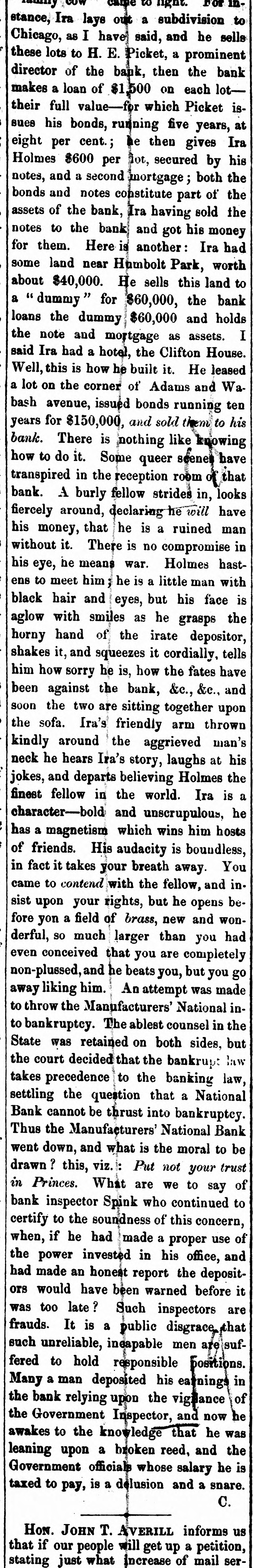 many COW came to night. stance, Ira lays out a subdivision to Chicago, as I have said, and he sells these lots to H. E. Picket, a prominent director of the bank, then the bank makes a loan of $1,500 on each lottheir full value-for which Picket issues his bonds, running five years, at eight per cent.; be then gives Ira Holmes $600 per lot, secured by his notes, and a second mortgage; both the bonds and notes constitute part of the assets of the bank, Ira having sold the notes to the bank and got his money for them. Here is another : Ira had some land near Humbolt Park, worth about $40,000. He sells this land to a dummy" for $60,000, the bank loans the dummy $60,000 and holds the note and mortgage as assets. I said Ira had a hotel, the Clifton House. Well, this is how he built it. He leased a lot on the corner of Adams and Wabash avenue, issued bonds running ten years for $150,000, and sold them to his bank. There is nothing like knowing how to do it. Some queer scenet have transpired in the reception room of that bank. A burly fellow strides in, looks fiercely around, declaring he will have his money, that he is a ruined man without it. There is no compromise in his eye, he means war. Holmes hastens to meet him ; he is a little man with black hair and eyes, but his face is aglow with smiles as he grasps the horny hand of the irate depositor, shakes it, and squeezes it cordially, tells him how sorry he is, how the fates have been against the bank, &c., &c., and soon the two are sitting together upon the sofa. Ira's friendly arm thrown kindly around the aggrieved man's neck he hears Ira's story, laughs at his jokes, and departs believing Holmes the finest fellow in the world. Ira is a character-bold and unscrupulous, he has a magnetism which wins him hosts of friends. His audacity is boundless, in fact it takes your breath away. You came to contend with the fellow, and in sist upon your rights, but he opens before you a field of brass, new and wonderful, so much larger than you had even conceived that you are completely non-plussed, and he beats you, but you go away liking him. An attempt was made to throw the Manufacturers' National into bankruptcy. The ablest counsel in the State was retained on both sides, but the court decided that the bankrup: law takes precedence to the banking law, settling the question that a National Bank cannot be thrust into bankruptcy. Thus the Manufacturers' National Bank went down, and what is the moral to be drawn? this, viz. Put not your trust in Princes. What are we to say of bank inspector Spink who continued to certify to the soundness of this concern, when, if he had made a proper use of the power invested in his office, and had made an honest report the depositors would have been warned before it was too late ? Such inspectors are frauds. It is a public disgrace, that such unreliable, incapable men are suffered to hold responsible positions. Many a man deposited his earnings in of the bank relying upon the vigiance the Government Inspector, and now he awakes to the knowledge that he was leaning upon a broken reed, and the Government officials whose salary he is taxed to pay, is a delusion and a snare. C. HON. JOHN T. AVERILL informs us that if our people will get up a petition, stating just what increase of mail ser-