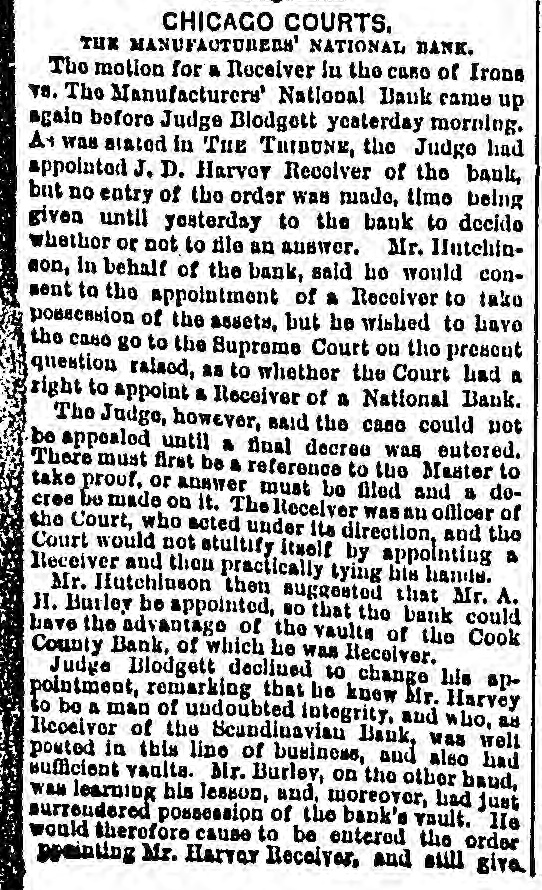 CHICAGO COURTS, THE MANUFACTURERS' NATIONAL BANK. The motion for a Receiver In the case of Irons vs. The Manufacturers' National Bank came up again before Judge Blodgett yeaterday morning. A1 was stated in THE TRIBUNE, the Judge had appointed J. D. Harvey Receiver of the bank, but no entry of the order was made, time being given until yesterday to the bank to decide whether or not to tile an answer. Mr. Hutchinson, in behalf of the bank, said he would consent to the appointment of a Receiver to take possession of the assets, but be wished to have the case go to the Supreme Court on the present question raised, as to whether the Court had a right to appoint & Receiver of a National Bank. The Judge, however, said the case could not be appealed until & final decree was entered. There must first be & reference to the Master to take proof, or answer must be filed and a docree be made on it. The Receiver was an officer of the Court, who acted under its direction, and the Court would not stultify itself by appointing A Receiver and then practically tying bis hands. Mr. Hutchluson then suggested that Mr. A. H. Burley be appointed, NO that the bank could have the advantage of the vaults of the Cook County Bank, of which he was Receiver. Judge Blodgett declined to change his Bppointment, remarking that be knew Mr. Harvey to be A man of undoubted integrity, and who, as Receiver of the Scandinavian Bank, was well posted in this line of business, and also had sufficient vaulta. Dir. Burley, on the other band, was learning his lesson, and, moreover, had just surrendered possession of the bank's vault. He would therefore cause to be entered the order prointing Mr. Harver Receiver, and still giva