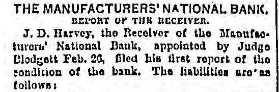 # THE MANUFACTURERS' NATIONAL BANK. REPORT OF THE RECEIVER. J. D. Harvey, the Receiver of the Manufacturers' National Bank, appointed by Judge Blodgett Feb. 20, filed his first report of the condition of the bank. The liabilities aro'as follows: