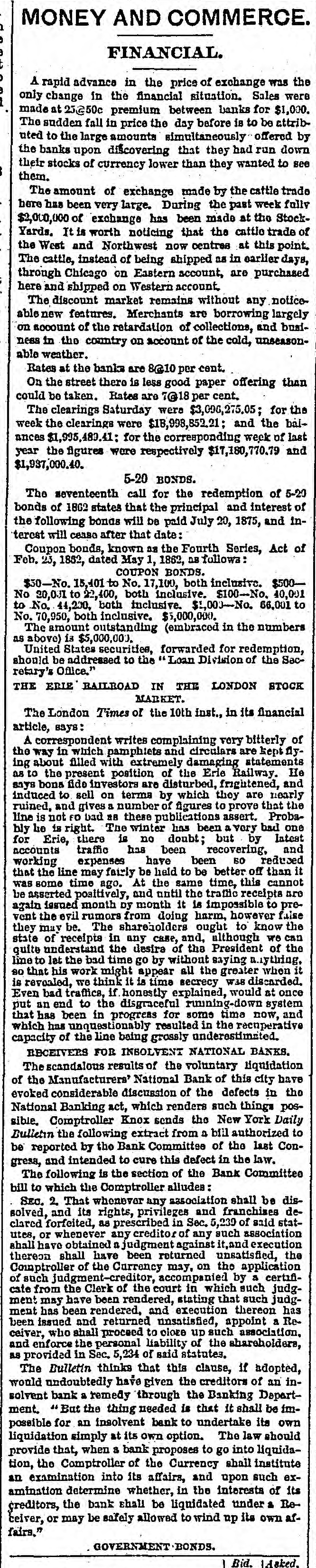 MONEY AND COMMERCE. FINANCIAL. A rapid advance in the price of exchange was the only change in the financial situation. Sales were made at 25@50c premium between banks for $1,000. The sudden fall in price the day before is to be attributed to the large amounts simultaneously offered by the banks upon discovering that they had run down their stocks of currency lower than they wanted to see them. The amount of exchange made by the cattle trade here has been very large. During the past week fully $2,000,000 of exchange has been made at the StockYards. It is worth noticing that the cattle trade of the West and Northwest now centres at this point. The cattle, instead of being shipped as in earlier days, through Chicago on Eastern account, are purchased here and shipped on Western account, The discount market remains without any noticeable new features. Merchants are borrowing largely on account of the retardation of collections, and business in the country on account of the cold, unseasonable weather. Rates at the banks are 8@10 per cent. On the street there is less good paper offering than could be taken. Rates are 7@18 per cent. The clearings Saturday were $3,096,275.05; for the week the clearings were $18,998,852.21; and the baiances $1,995,489.41: for the corresponding week of last year the figures were respectively $17,180,770.79 and $1,937,000.40. 5-20 BONDS. The seventeenth call for the redemption of 5-20 bonds of 1862 states that the principal and interest of the following bonds will be paid July 20, 1875, and intercet will cease after that date: Coupon bonds, known as the Fourth Series, Act of Feb. 23, 1852, dated May 1, 1862, ns follows: COUPON BONDS. $30-No. 15,401 to No. 17,100, both inclusive. $500No 20,001 to 22,400, both inclusive. $100-No. 40,001 to No. 44,200, both inclusive. $1,000-No. 66,001 to No. 70,950, both inclusive. $5,000,000. The amount outstanding (embraced in the numbers as above) is $5,000,000. United States securities, forwarded for redemption, should be addressed to the Loan Division of the Sacretary's Office." THE ERIE HAILROAD IN THE LONDON STOCK MARKET. The London Times of the 10th inst., in its financial article, says: A correspondent writes complaining very bitterly of the way in which pamphiets and circulars are kept flying about filled with extremely damaging statements as to the present position of the Erie Railway. He says bons fide investors are disturbed, frightened, and induced to sell on terms by which they are nearly ruined, and gives a number of figures to prove that the line is not FO bad as these publications assert. Probably he is right. The winter has been a very bad one for Erie, there is no doubt; but by latest accounts traffic has been recovering, and working expenses have been so reduced that the line may fairly be held to be better off than it was some time ago. At the same time, this cannot be asserted positively, and until the traffic receipts are again issued month by month it is impossible to prevent the evil rumors from doing harm, however false they may be. The shareholders ought to know the state of receipts in any case, and, although we can quite understand the desire of the President of the line to lat the bad time go by without saying anything, 80 that his work might appear all the greater when it is revealed, we think it is time secrecy W38 discarded. Even bad traffics, if honestly explained, would at once put an end to the disgraceful running-down system that has been in progress for some time now, and which has unquestionably resulted in the recuperative capacity of the line being grossly underestimated. RECEIVERS FOR INSOLVENT NATIONAL BANKS. The scandalous results of the voluntary liquidation of the Manufacturers' National Bank of this city have evoked considerable discussion of the defects in the National Banking act, which renders such things possible, Comptroller Knox sends the New York Daily Bulletin the following extract from a bill authorized to be reported by the Bank Committee of the last Congress, and intended to cure this defect in the law. The following is the section of the Bank Committee bill to which the Comptroller alludes SEC. 2. That whenever any association shall be dissolved, and its rights, privileges and franchises declared forfeited, as prescribed in Sec. 5,239 of said statutes, or whenever any creditor of any such association shall have obtained a judgment against it,and execution thereon shall have been returned unsatisfied, the Comptroller of the Currency may, on the application of such judgment-creditor, accompanied by a certificate from the Clerk of the court in which such judgment may have been rendered, stating that such judgment has been rendered, and execution thereon has been issued and returned unsatisfied, appoint a Receiver, who shall proceed to close up such association, and enforce the personal liability of the shareholders, as provided in Sec. 5,234 of said statutes. The Bulletin thinks that this clause, if adopted, would undoubtedly have given the creditors of an insolvent bank a remedy through the Banking Department. But the thing needed is that it shall be impossible for an insolvent bank to undertake its own liquidation simply at its own option. The law should provide that, when a bank proposes to go into liquidation, the Comptroller of the Currency shall institute an examination into its affairs, and upon such examination determine whether, in the interests of its greditors, the bank shall be liquidated under & Rebeiver, or may be safely allowed to wind up its own affairs," GOVERNMENT BONDS. Bid. 1.Asked.