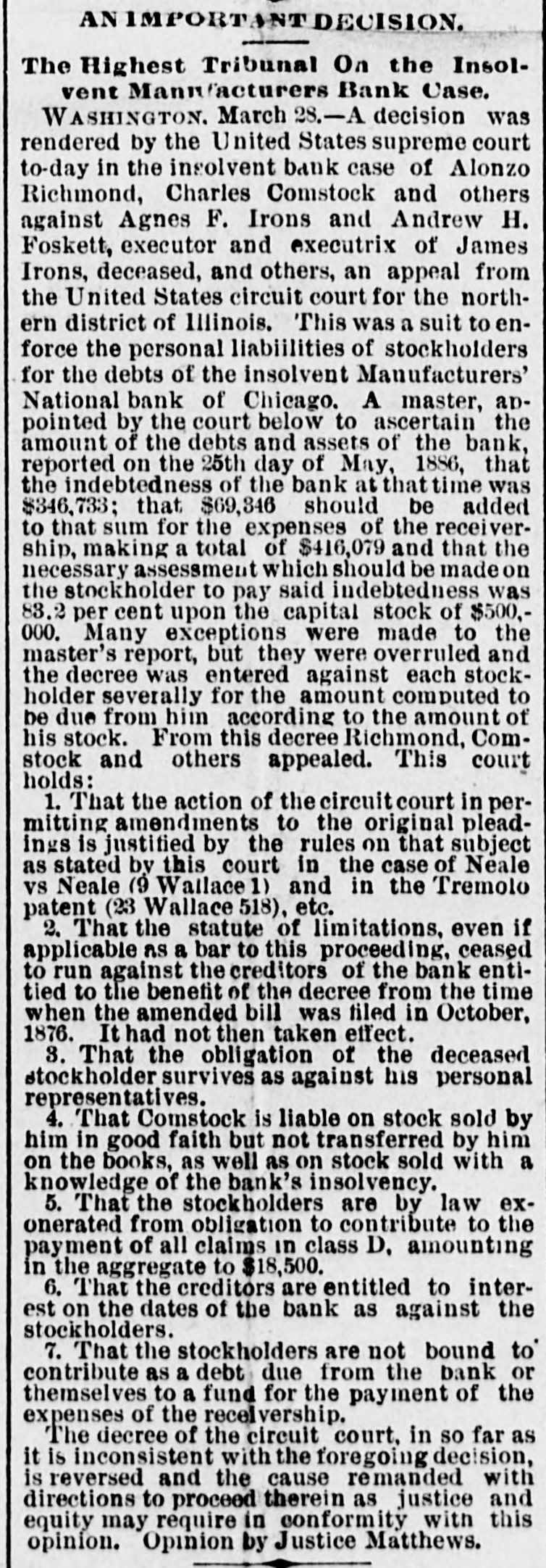 IMPORT NT DECISION. The Highest Tribunal On the Insolvent Mann facturers Bank Case. WASHINGTON. March 28.-A decision was rendered by the United States supreme court to-day in the insolvent bank case of Alonzo Richmond, Charles Comstock and others against Agnes F. Irons and Andrew H. Foskett, executor and executrix of James Irons, deceased, and others, an appeal from the United States circuit court for the northern district of Illinois. This was a suit to enforce the personal liabilities of stockholders for the debts of the insolvent Manufacturers' National bank of Chicago. A master, anpointed by the court below to ascertain the amount of the debts and assets of the bank, reported on the 25th day of May, 1886, that the indebtedness of the bank at that time was $346,733; that $69,346 should be added to that sum for the expenses of the receivership, making a total of $416,079 and that the necessary assessment which should be made on the stockholder to pay said indebtedness was 83.2 per cent upon the capital stock of $500,000. Many exceptions were made to the master's report, but they were overruled and the decree was entered against each stockholder severally for the amount computed to be due from him according to the amount of his stock. From this decree Richmond, Comstock and others appealed. This court holds: 1. That the action of the circuit court in permitting amendments to the original pleadings is justified by the rules on that subject as stated by this court in the case of Neale vs Neale (9 Wallace 1) and in the Tremolo patent (23 Wallace 518), etc. 2. That the statute of limitations, even if applicable as a bar to this proceeding, ceased to run against the creditors of the bank entitied to the benefit of the decree from the time when the amended bill was filed in October, 1876. It had not then taken effect. 3. That the obligation of the deceased stockholder survives as against his personal representatives. 4. That Comstock is liable on stock sold by him in good faith but not transferred by him on the books, as well as on stock sold with a knowledge of the bank's insolvency. 5. That the stockholders are by law exonerated from obligation to contribute to the payment of all claims in class D, amounting in the aggregate to $18,500. 6. That the creditors are entitled to interest on the dates of the bank as against the stockholders. 7. That the stockholders are not bound to' contribute as a debt due from the bank or themselves to a fund for the payment of the expenses of the receivership. The decree of the circuit court, in so far as it is inconsistent with the foregoing decision, is reversed and the cause remanded with directions to proceed therein as justice and equity may require in conformity with this opinion. Opinion by Justice Matthews.