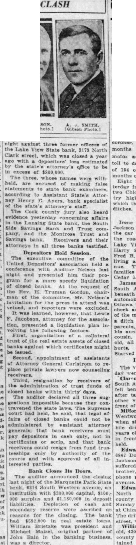 CLASH night against three former officers of the Lake View State Clark street, which was estimated the state's office to be in excess of The names were held, are accused of to Henry bank of the The Cook heard evidence affairs the Lansing the Side pany, and the Trust and Savings and their attorneys in all three banks testified. Depositors Hold Session. The committee of the United association held last and presented him their gram for speedy liquidation of closed At the request of the H. man the Mr. for the press to attend vetoed, and were It was that Lewis F. Jacobson, attorney for the association, presented a liquidation plan involving the following of collateral trust of the real estate assets of closed banks against which certificates might be Second, appointment of assistants of Attorney General to place now receivers. resignation by receivers the of trust funds of closed banks within thirty days. declared all three because the state laws. Supreme court he that legal fairs of closed banks could not be by assistant attorney generals; that bank receivers must pay depositors in cash only, in certificates or scrip, and that bank receivers could resign from fund trusteeships only by authority the courts and approval of all interested parties.
