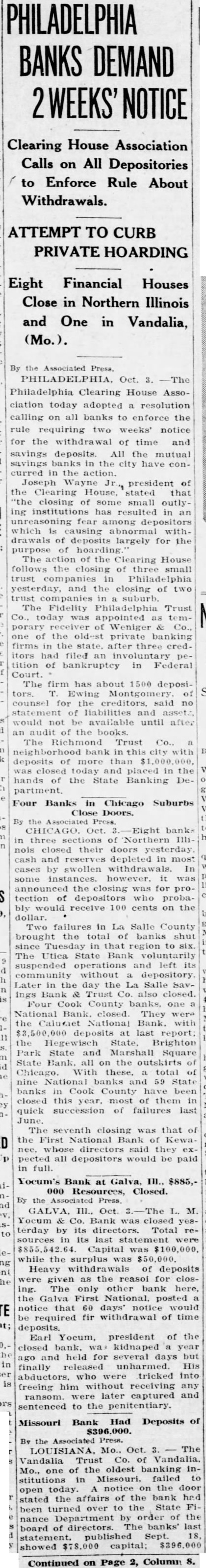 BANKS DEMAND WEEKS' Clearing House Association Calls on All Depositories to Enforce Rule About Withdrawals. ATTEMPT TO CURB PRIVATE HOARDING Eight Financial Houses Close in Northern Illinois and One in Vandalia, Associated Oct. Philadelphia Clearing House ciation today adopted resolution calling on all banks to enforce the rule requiring two weeks' notice for the withdrawal of time and savings deposits. All the mutual banks in the city have concurred in action. Joseph Wayne president of the Clearing House, stated that closing of some small outlying institutions has resulted in an unreasoning fear among depositors which causing abnormal withdrawals of deposits largely for the purpose hoarding The action of the Clearing House follows of three small trust companies yesterday, and the closing of trust suburb. The Fidelity Co., today appointed Weniger one of the oldest private banking firms in the state. after three creditors filed involuntary tition of bankruptcy in Federal Court. The firm has about depositors. Ewing counsel for creditors, said no statement of liabilities and would not available until after audit of the books. The Richmond Trust bank this deposits of more than today and placed in the hands of the State Banking partment. Four Banks in Chicago Suburbs Close Doors. By the Associated Oct. banks three sections of nois closed their doors yesterday cash and reserves depleted in most cases by swollen withdrawals. In instances. announced closing was for protection depositors who bly would receive cents on the dollar. Two failures in La Salle County brought the total of banks shut since Tuesday in that region to six. The Utica State Bank suspended operations and left its without depository Later in the day the La Salle ings Bank Trust Co. also closed. Four Cook County banks, one National Bank. closed They the Calumet National Bank. with deposits last report the Hegewisch Brighton Park State and Marshall Square State Bank. all on outskirts Chicago. With total nine National 59 State banks Cook County have been closed this year. most of them in quick succession of failures last The seventh closing was that of the First National Bank Kewadirectors said pected all depositors would be paid in full. Yocum's Bank at Galva, $885,Resources, Closed. the Yocum Bank closed yesterday by its directors. Total in its last statement Capital was while the surplus Heavy of deposits given as the for closing. The only other bank the Galva First National, posted notice that days' notice would required fir withdrawal of time deposits. Earl Yocum, president of the closed bank. kidnaped year ago and held for several days but finally released unharmed. His abductors. who tricked into freeing him without receiving any ransom. later captured and sentenced to the penitentiary. Missouri Bank Had Deposits of $396,000. the Associated Press. Mo., Oct. Vandalia Trust Co. of Vandalia. of the oldest banking Mo., one stitutions in Missouri, failed notice the door open today. the affairs of the bank had stated to the State Fibeen turned over by order of the nance Department of directors. The banks' last board published Sept. 18, statement. showed $78,000 capital; Continued on Page Column