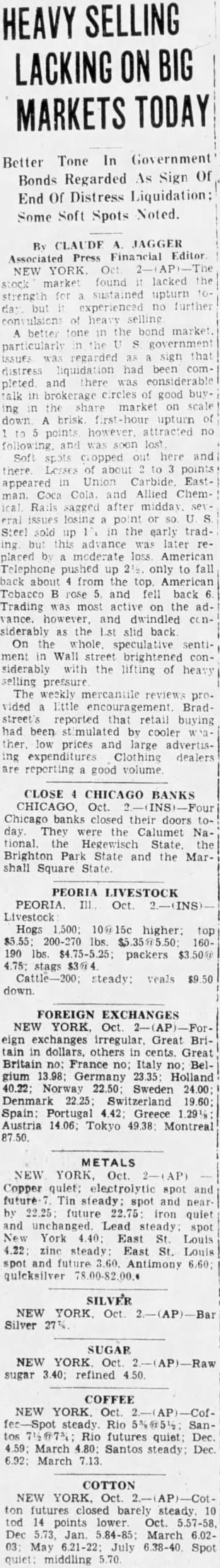 HEAVY SELLING LACKING ON BIG MARKETS TODAY Tone In Government Better Bonds Regarded As Sign Of End Of Distress Liquidation: Some Soft Spots Noted. By CLAUDE JAGGER Associated Press Financial Editor NEW YORK. strength for sustained upturn experienced further better tone in the bond market. particularly government issues regarded sign that distress liquidation had been pleted and considerable talk in brokerage of good buyshare market on scale ing down brisk upturn of points attracted no following. and was Sof spots cropped out here and there Lesses about points appeared in Union Carbide EastCoca Cola and Allied Chemical Rails sagged after midday losing point or Steel up early trading. this advance was later replaced moderate loss American Telephone pushed up only fall about from the top. American Tobacco B rose and fell back Trading was most active on the advance. however, and dwindled considerably as the Lst slid back On the whole speculative sentiment Wall street brightened considerably with the lifting of heavy selling pressure The weekly mercantile reviews prostreet's reported retail buying had been by cooler ther low prices and large advertising expenditures Clothing dealers are reporting good volume CLOSE CHICAGO BANKS CHICAGO, Oct. Chicago banks closed their doors today. They the Calumet National. State the Brighton Park State and the Marshall Square State. PEORIA LIVESTOCK Livestock Hogs 1,500; higher: top $5.55; 200-270 lbs. 160190 lbs. $4.75-5.25; packers $3.50 stags Cattle-200; steady: veals $9.50 FOREIGN EXCHANGES NEW YORK, eign exchanges irregular. Great Briin dollars, others cents. Great Britain France no; no; Bel23.35 Holland 40.22; Norway 22.50; Sweden 24.00; Denmark 22.25 Switzerland 19.60; Spain: Portugal Greece 1.29% Austria 14.06; Tokyo 49.38: Montreal 87.50. METALS NEW YORK. Oct. Copper quiet: electrolytic spot and future Tin steady: spot and nearby 22.25 future 22.75 iron quiet and unchanged. Lead steady: spot York East St. Louis 4.22: zinc steady East St. Louis SILVER NEW YORK Oct. Silver 27% SUGAR NEW YORK Oct sugar 3.40; refined 4.50 COFFEE NEW YORK Oct. tos 7407%: Rio futures quiet: Dec 4.59 March 4.80: Santos steady: Dec 6.92: March 7.13 COTTON NEW YORK. Oct ton steady. 10 tod points lower Oct. Dec 5.73. Jan. 5.84-85 March 6.02May 6.21-22; July 6.38-40 Spot quiet middling 5.70