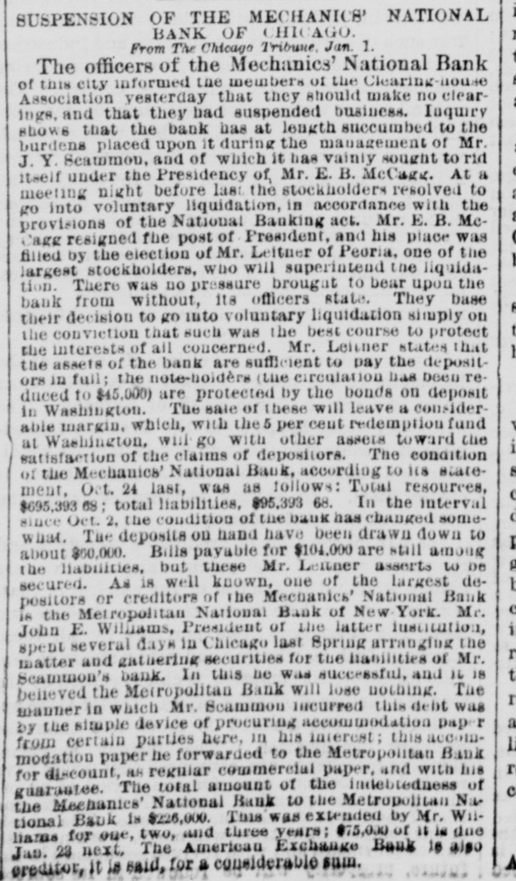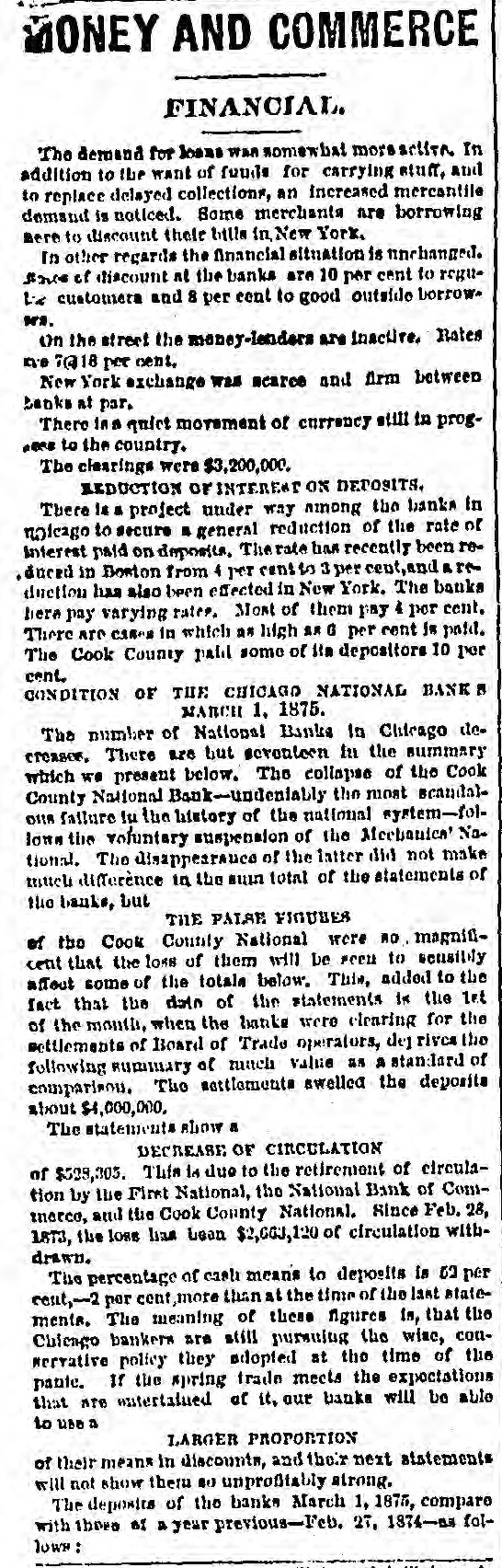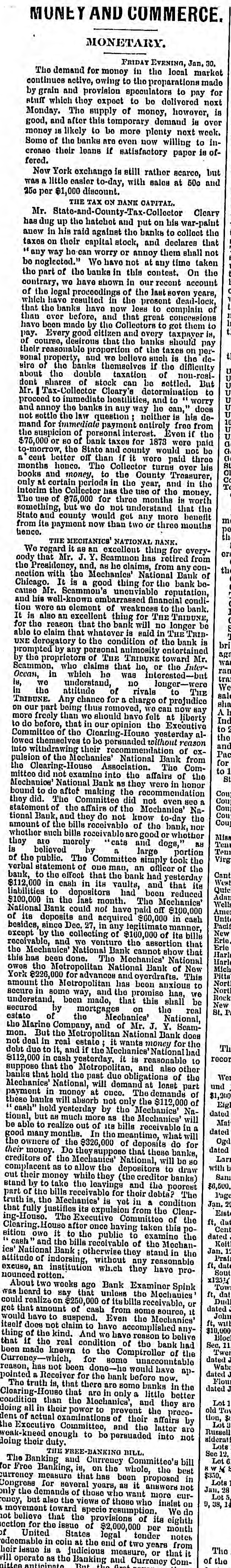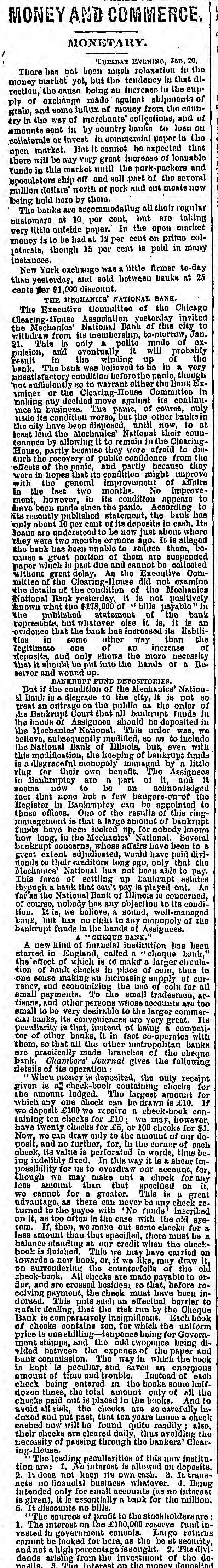 MONEY AND COMMERCE. MONETARY TUESDAY EVENING, Jan. 20, There has not been much relaxation in the money market yot, but the tendonoy in that direction, the cause boing an increase in the suj ply of exchange mhilo against shipments of grain, and some iuflux of nuouoy from the country in the way of merchants collections, and of amounts sout in by country banks to loan ou collaterals or invest in commercial paper in the open market But It cannot be expected that there will be any very great increase of loanablo Yunde in this market until the rk-packers and )spoculators ship off and sell part of the several million dollare worth of pork and out meats now being hold here by them. The banks are accommodating all their regular customers at 10 por cont, but are taking very little outside paper. In the open market money is to be had at 12 per cont on primo col gaterale, though 15 por cent is paid in many instances. Now York exchange was little firmer to-day than yesterday, and sold between banks at 25 cente per $1,000 discount. THE MEOHANICS' NATIONAL BANK. The Executive Committee of the Chicago Clearing-House Association yosterday invited the Mechanics National Bank of this city to withdraw from its mom borship, to-morrow, Jan. 21. This is only polito modo of expulsion, and eventua it will probably result in the winding no of the bank. The bank was believed to be in a very unsatisfactory condition before the papic thoug not sufficiently 60 to warrant eithor the Bank Examinor or the Clearing- House Committee in making any decided move against its continu inco in business. The panic, of course, only made its condition worse, but the other bauksin the city have been disposed, until now, to at least lend the Mechanics' National their countenance by allowing it to remain in the Clearing House, partly because they wore afraid turb the recovery of public confidence from the effects of the panic, and partly because they were in hopes that its condition might improve with the gonoral improvement of affairs In the last two months. No improvemont however, in its condition appears to have been made since the panio. According to Site recently published statement the bank has only about percent of its deposit in cash lte Acaus are understood to bo now just about where they woro two months or more ago. It is alloged the bank has been unablo to reduce them, bo cause great portion of them are suspended paper which is past due and cannot be collected without great delay As the Executive Committeo of the Clearing House did not examine the dotails of the condition of the Mechanics National Bank yesterday. it is not positively known what the $178,000 of bills payable' in the published statement of the bank represents, but whatover olso it ie. is an evidence that the bank has increased its liabilities in some other way than the of logitimate one of an increase deposits, and only shows the more necessity that it should be put into the hauds of a ReDelver and wound up BANKRUPT FUND DEPOSITORIES. But if the condition of the Mechanics Nationbl Bank is disgrace to the city, it is not 80 of treat an outrage on the public as the order in the Bankrupt Court that all bankrupt funds the hands of Assignees should be deposited in the Dichanics National This order WAS, we believe, subsequent ly modified, 80 as to include the National Bank of Illinois, but, even with this modification, the keeping of bankrupt funds is a disgraceful monopoly managed by a littlo ring for their own benefit. The Assignees it in Bankruptcy are a part of it. and seems now to be an acknowledged fact that none but 8 few bangers on of the Register in Bankruptcy can be appointed to those offices. One of the results of this ringmanagement is that large amount of bankrupt funds have boon locked up, for nobody knows how long, in the Mechanic National Several bankrupt concerns, whose affairs have beon to a great extent adjudicated would have paid dividende to their creditors long ago, only that the Mechanics' National has not been able to pay This farce of settling up bankrupt estates through bank that cau DAY is played out. As far as the National Bank of Illinois is concerned of courso, nobody has any objection to its condition. It is, we believe, sound, well-mauaged bank, but has no right to any monopoly of the baukrupt faude in the hands of Assiguees. BANK. CHEQUE A new kind of financial institution line been started in Eugland called a cheque bank the effect of which is to makd a larger circula tion of bank checks in place of 0010, thus in one sense making au increasing supply of currency, and econom the use of coin for all emall payments. To the small tradesmen, artienne and other persons whose accounts are too small to be very desirable to the larger commercial banks, its conveniences are very great. Ite peouliarity is that, instead of being a competi tor of other banks, it in fact co-operates with them, so that all the ther motropolita: banks are practically made branches of the cheque bank. Chambers' Journal gives the following details of its operation When money is deposited, the only receipt given is at check-book containing chocks for the amount lodged. Tho largest amount for which any one check can be drawn is £10. If we deposit £100 we receive a check book containing ten checks for £10 we may, howev have twenty checks for £5. or 100 check for $1 Now, we can draw only to the amount of our doposit, and no further. for. in the corner of each check, its value is perforated in words, time boing indelibly fixed. In this way it is shoor impossibility for us to overdraw our account, for, though we may make out & chock for any less amount than that specified on it, we cannot for greater. This is great advantage, as there can never be any check re. turned to the payee with No funds inscribed on it, as too often is the case with the old eyea tem. If, then, we make out some checks for less amount than that specified. there must be balance standing at our cr