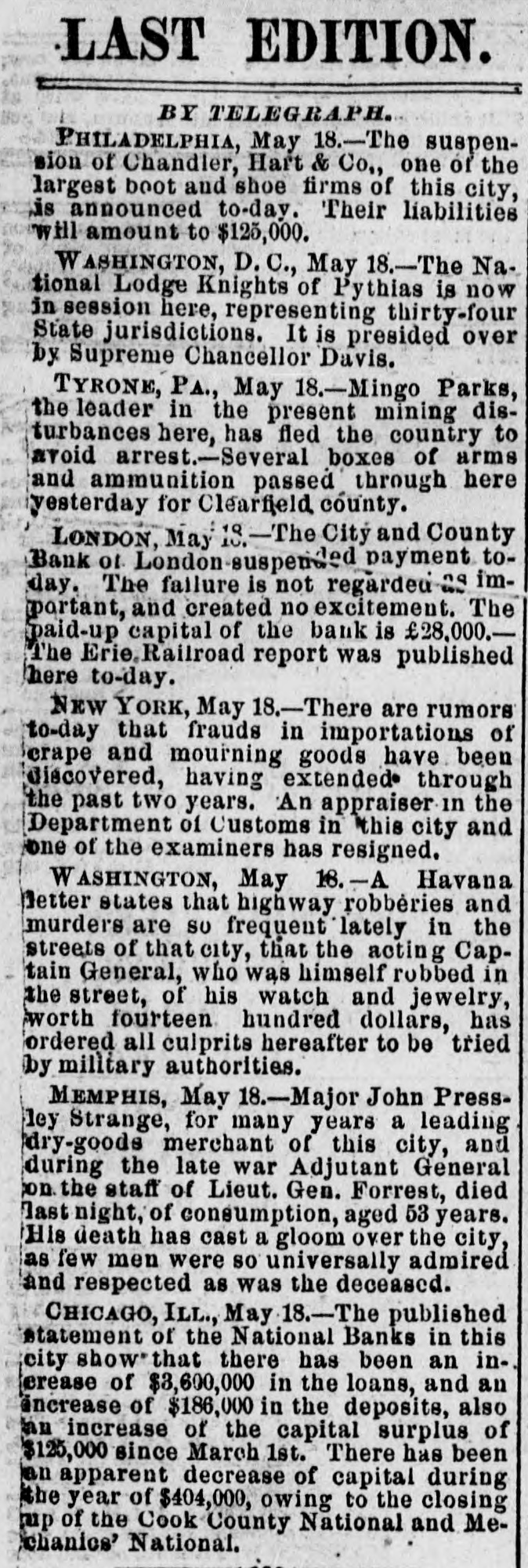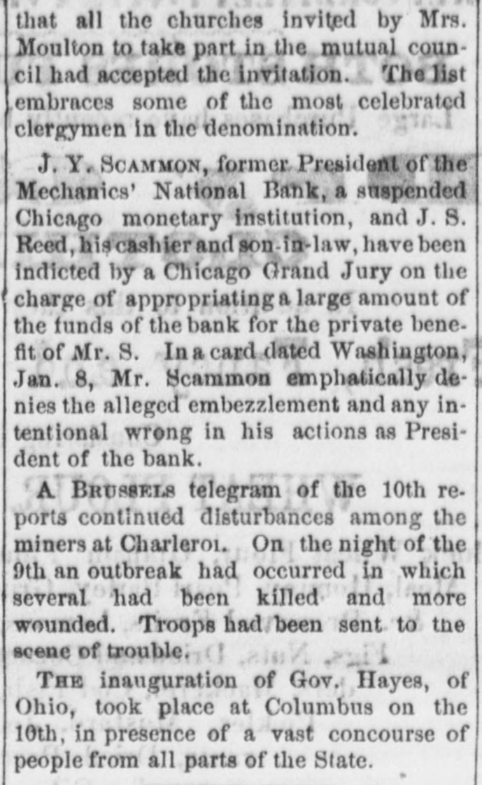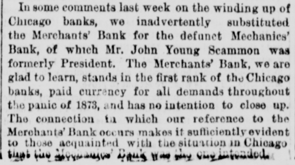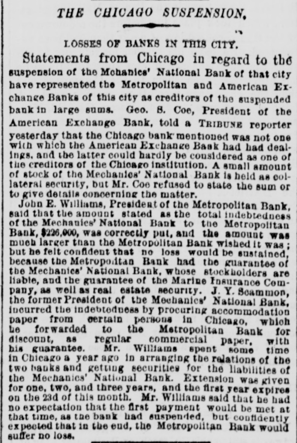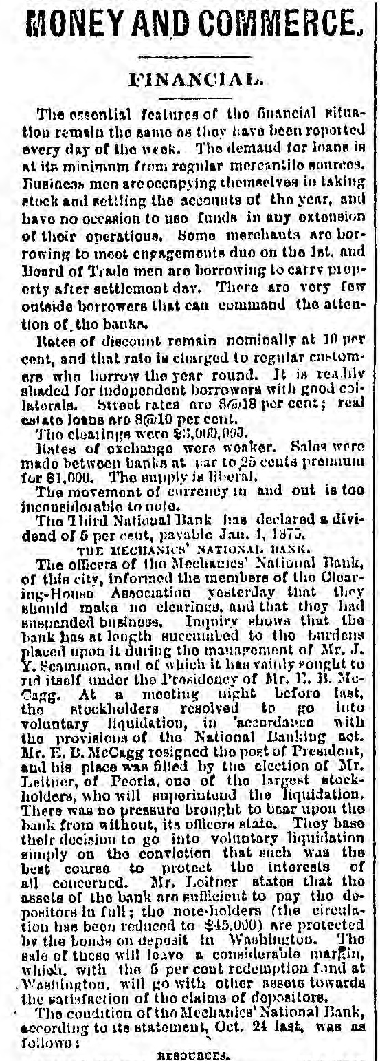 MONEY AND COMMERCE. MONETARY TUESDAY EVENING, Jan. 20, There has not been much relaxation in the money market yot, but the tendonoy in that direction, the cause boing an increase in the suj ply of exchange mhilo against shipments of grain, and some iuflux of nuouoy from the country in the way of merchants collections, and of amounts sout in by country banks to loan ou collaterals or invest in commercial paper in the open market But It cannot be expected that there will be any very great increase of loanablo Yunde in this market until the rk-packers and )spoculators ship off and sell part of the several million dollare worth of pork and out meats now being hold here by them. The banks are accommodating all their regular customers at 10 por cont, but are taking very little outside paper. In the open market money is to be had at 12 per cont on primo col gaterale, though 15 por cent is paid in many instances. Now York exchange was little firmer to-day than yesterday, and sold between banks at 25 cente per $1,000 discount. THE MEOHANICS' NATIONAL BANK. The Executive Committee of the Chicago Clearing-House Association yosterday invited the Mechanics National Bank of this city to withdraw from its mom borship, to-morrow, Jan. 21. This is only polito modo of expulsion, and eventua it will probably result in the winding no of the bank. The bank was believed to be in a very unsatisfactory condition before the papic thoug not sufficiently 60 to warrant eithor the Bank Examinor or the Clearing- House Committee in making any decided move against its continu inco in business. The panic, of course, only made its condition worse, but the other bauksin the city have been disposed, until now, to at least lend the Mechanics' National their countenance by allowing it to remain in the Clearing House, partly because they wore afraid turb the recovery of public confidence from the effects of the panic, and partly because they were in hopes that its condition might improve with the gonoral improvement of affairs In the last two months. No improvemont however, in its condition appears to have been made since the panio. According to Site recently published statement the bank has only about percent of its deposit in cash lte Acaus are understood to bo now just about where they woro two months or more ago. It is alloged the bank has been unablo to reduce them, bo cause great portion of them are suspended paper which is past due and cannot be collected without great delay As the Executive Committeo of the Clearing House did not examine the dotails of the condition of the Mechanics National Bank yesterday. it is not positively known what the $178,000 of bills payable' in the published statement of the bank represents, but whatover olso it ie. is an evidence that the bank has increased its liabilities in some other way than the of logitimate one of an increase deposits, and only shows the more necessity that it should be put into the hauds of a ReDelver and wound up BANKRUPT FUND DEPOSITORIES. But if the condition of the Mechanics Nationbl Bank is disgrace to the city, it is not 80 of treat an outrage on the public as the order in the Bankrupt Court that all bankrupt funds the hands of Assignees should be deposited in the Dichanics National This order WAS, we believe, subsequent ly modified, 80 as to include the National Bank of Illinois, but, even with this modification, the keeping of bankrupt funds is a disgraceful monopoly managed by a littlo ring for their own benefit. The Assignees it in Bankruptcy are a part of it. and seems now to be an acknowledged fact that none but 8 few bangers on of the Register in Bankruptcy can be appointed to those offices. One of the results of this ringmanagement is that large amount of bankrupt funds have boon locked up, for nobody knows how long, in the Mechanic National Several bankrupt concerns, whose affairs have beon to a great extent adjudicated would have paid dividende to their creditors long ago, only that the Mechanics' National has not been able to pay This farce of settling up bankrupt estates through bank that cau DAY is played out. As far as the National Bank of Illinois is concerned of courso, nobody has any objection to its condition. It is, we believe, sound, well-mauaged bank, but has no right to any monopoly of the baukrupt faude in the hands of Assiguees. BANK. CHEQUE A new kind of financial institution line been started in Eugland called a cheque bank the effect of which is to makd a larger circula tion of bank checks in place of 0010, thus in one sense making au increasing supply of currency, and econom the use of coin for all emall payments. To the small tradesmen, artienne and other persons whose accounts are too small to be very desirable to the larger commercial banks, its conveniences are very great. Ite peouliarity is that, instead of being a competi tor of other banks, it in fact co-operates with them, so that all the ther motropolita: banks are practically made branches of the cheque bank. Chambers' Journal gives the following details of its operation When money is deposited, the only receipt given is at check-book containing chocks for the amount lodged. Tho largest amount for which any one check can be drawn is £10. If we deposit £100 we receive a check book containing ten checks for £10 we may, howev have twenty checks for £5. or 100 check for $1 Now, we can draw only to the amount of our doposit, and no further. for. in the corner of each check, its value is perforated in words, time boing indelibly fixed. In this way it is shoor impossibility for us to overdraw our account, for, though we may make out & chock for any less amount than that specified on it, we cannot for greater. This is great advantage, as there can never be any check re. turned to the payee with No funds inscribed on it, as too often is the case with the old eyea tem. If, then, we make out some checks for less amount than that specified. there must be balance standing at our cr
