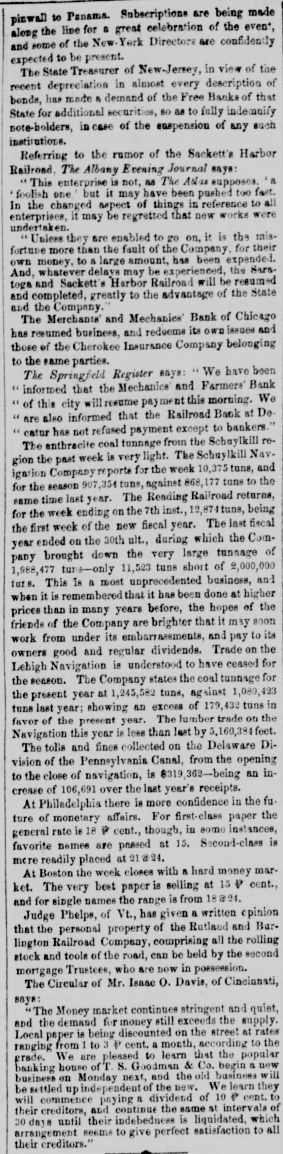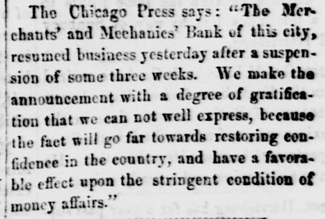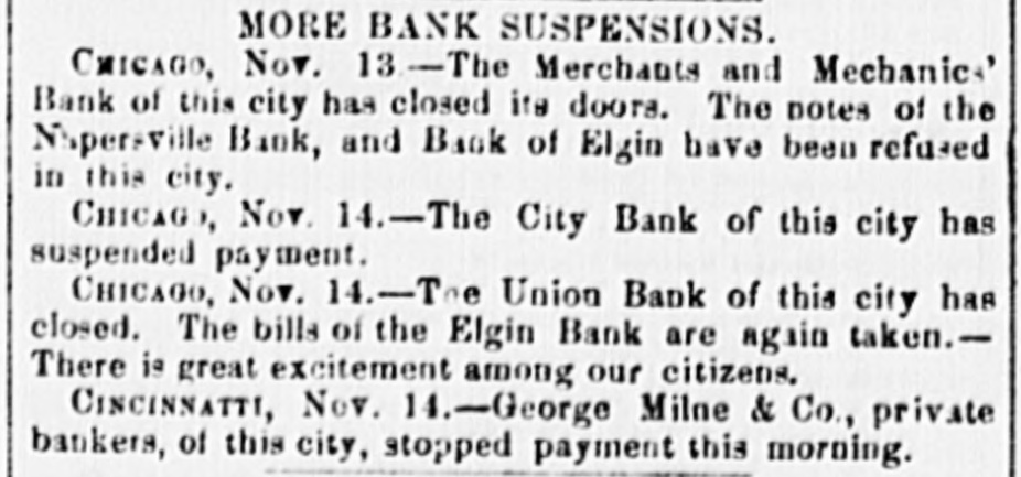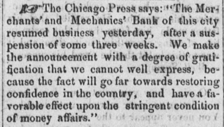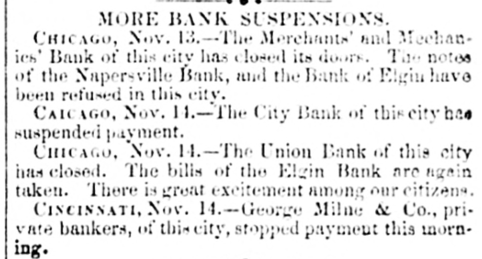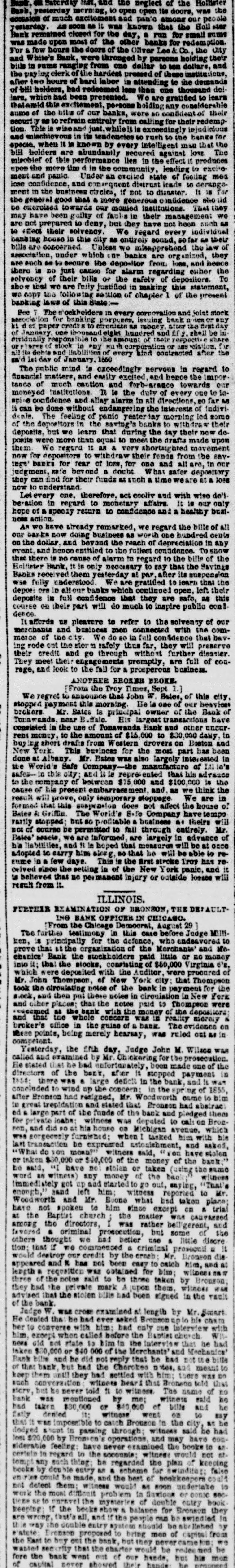 - Baterd Inst, and the neglect of the Hollster Bank, yesterday morning, to open open its doors, was the or much excitement and pan's among our people pesterday AS soon as it was known that the Holl star Bank remained closed for the day, run for small sume of most a upon made other banks for redemption. For afew hours the doors of the Oliver Lee & Co., the City and White's Bank, were thronged by persons holding their in pums ranging from one dellar to ten dollars, and pay lug clerk k of the hardest pressed of institutions, after two hours of bard labor in attending to the demands bad deemed 1114 delthan I holders, thousand one lars, which had been presented. We are gratified to learn this itement, persons bol ding holding any terable sume of the bills of our banks, were so cont Ident their securi y as to refrain entirely from calling for their redemption This is and wise and while is exceed injudictume in for # S hengs tendencies rush $ the specie. when It in known by every intellig ent man that the bill holders are abundantly secured against loss The this mischief of performance lien in effect sconpord " the upon the more time in the community leading to exciteUnder an ment and paulo excited THE state of feeling lose con and nent leads to derange ment in the business circles, if not to disaster It 18 for Miss . good genera and ahe more ontidence generous exercised our towards monied That institutions. they have been guilty of facts in their management we not do but , such been prepared have not deny, they effect their solvenov. We regard every individual bank ing house in this city as entirely sound, so far - their bills are concerned Unless we misapprehend the law association, under hich our banks are anized, they such - secure the depositor from loss, and heace there is no just cause for alarm regarding either the selvency of their bills OF the eafety of depositors. To show that we fully justified making this statement, copy the following section of chapter 1 of the present banking laws of this State Fee The e'ockholders in every cornoration and joint stock for banking porposes, issuing back paper credit circulate as modey alter the the dratday one beand shall pas hundred Tannery fify eight dividually respons this amount their respective share area stock in *Dy debts and every kind contracted after the let day of January 1860 The public mind is exceedingly nervous in regard to financial matters, and easily excited and hence the impor tance of much cantion and forbearance towards our moneyed institutions It to the duty of every one to icconfidence and allay alarm in all directions 20 far &S can done without be of Indivithe interests endangering deals The feeling of panic yester day morning led some the the s depositors banks withdraw their saving's saq that : learn their the de. new deposits, day during posits were more than equal to meet the drafts made upon them We regard IS as very shortsighted for now to withdraw their funds the savfrom ings' banks for rear of loss, for one and all are, in our safe becond doubt What judgment, safer depository they can and for their funds at such a weare a loss now understand Let Letevery one, therefore, act cooliv and with wise de'i beration in regard to monetary affairs. It is our only hope of specify return to confidence and healthy bustaction. AN we have already remarked, we regard the bille of all banks now doing business as worth one hundred cents the dollar and beyond the reach of depreciation in any mous & entitled fullest to and the condence. event, that there cause of alarm to regard to the bills of the Hollister the to that Hank, say STREATS only Deceasary Banks rece received them yesterday at par after its suspension was fully enderstood are gratided to learn that the deposit in all our banks which continued open, left their deposite in full confidence that they are safe, as this course on their part will do much to inspire public cont. dence. It affords us pleature to refer to the solvensy of our merchants and business men connected with the commerce of the We in full confidence that hav. rode out the stor safely thus far, they preserve their credit and go through without further disaster. They meet their engagements premptly, are full of conrage, and look to the fall for a prosperous business. ANOTHER BROKER BROKE. From the Troy Times, Sept 1.] We regret to ince ansounce that John Bater, of this city, stopped payment this morning. He is one heavice brokers Mr. Sates is principal owner of the Bank Tonawands. near B.ffaie. His largest transactions have consisted in the use of Tonawands Bank and other uncurrent money, to the amount of $15 000 $15,000 to $30 $30,000 000 daily, in buy 10g short drafts from estern drovers on Boston and New York. This usiness for the most part has been done at Albany. Mr. Bates was also largely in World's -the Safe manufacture of IVI 8,01 Company safes- in this city; and represented that his advance the company of between $75 000 and $100 000 $100,000 is the : to cause embarrasement the and think : present a result will prove, only temporary stoppage We are in formed that this suspension does not affect the house of Bates & Griffin. The World's Exfe Company tempo varily stopped; but profitable business at theirs will of course be permitted to fall through entirely. Mr Bates' nesels, we are informed are largely in advance of = and that will liabilities, be if hoped measures adopted to carry him along no nothat he will be able to resume in . few days. This 18 the first stroke Troy has reIved since setting in of the New York panic, and believed that no manent permanent Injury or outside losses will result from it. ILLINOIS. FURTHIR BE INAMINATION OF BRONSON, THE DE: AULTING BANK OFFICER IN CHICAGO. From the Chicago Democrat, August 29 The further testimony in this case before Judge Milliken, .8 principally for the defence, who endeavored prove that at the organization of the Merchants' and Mo. chanics' Bank the s