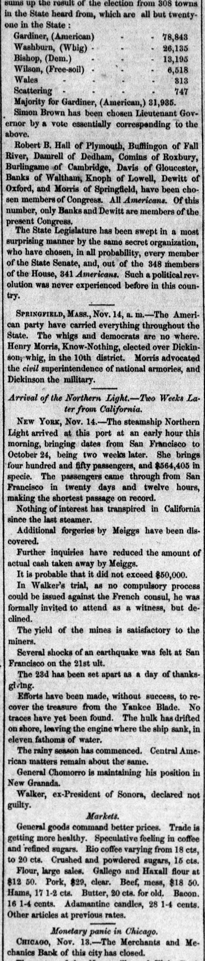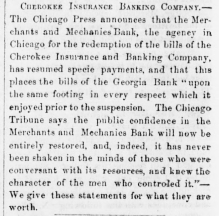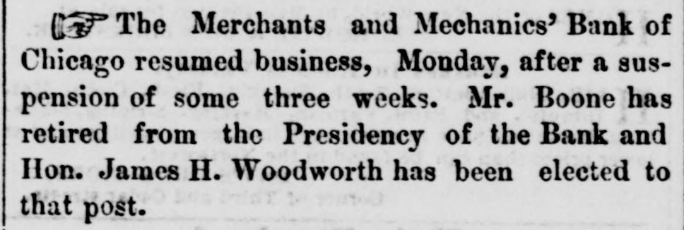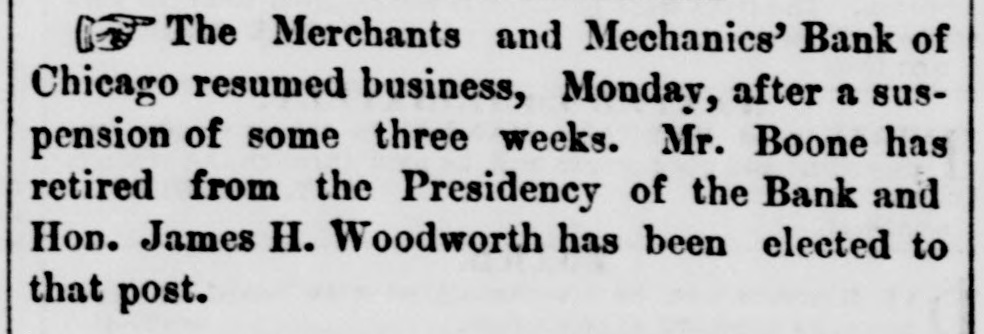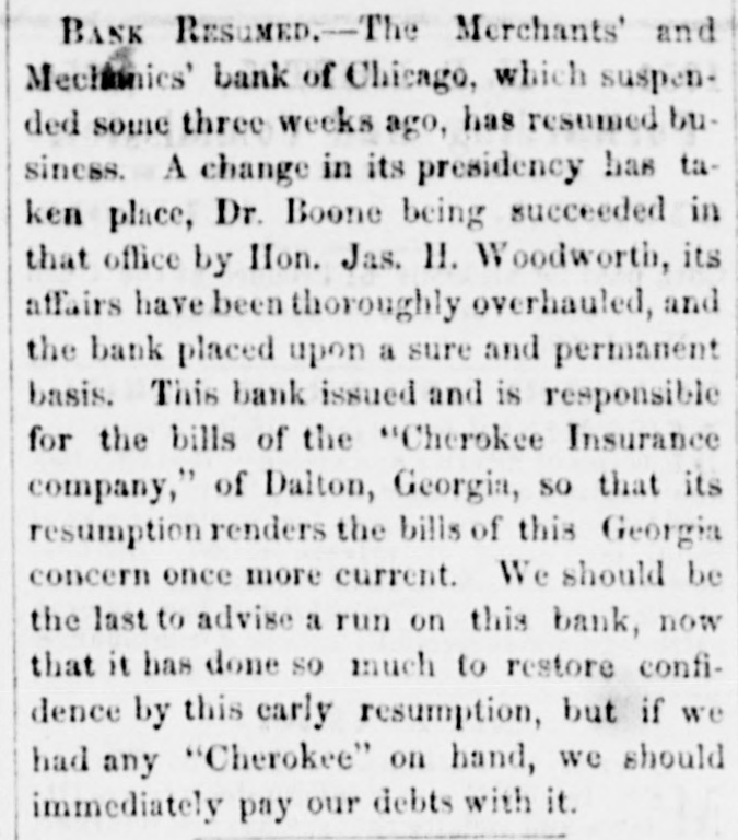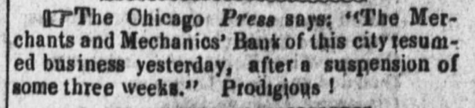- Baterd Inst, and the neglect of the Hollster Bank, yesterday morning, to open open its doors, was the or much excitement and pan's among our people pesterday AS soon as it was known that the Holl star Bank remained closed for the day, run for small sume of most a upon made other banks for redemption. For afew hours the doors of the Oliver Lee & Co., the City and White's Bank, were thronged by persons holding their in pums ranging from one dellar to ten dollars, and pay lug clerk k of the hardest pressed of institutions, after two hours of bard labor in attending to the demands bad deemed 1114 delthan I holders, thousand one lars, which had been presented. We are gratified to learn this itement, persons bol ding holding any terable sume of the bills of our banks, were so cont Ident their securi y as to refrain entirely from calling for their redemption This is and wise and while is exceed injudictume in for # S hengs tendencies rush $ the specie. when It in known by every intellig ent man that the bill holders are abundantly secured against loss The this mischief of performance lien in effect sconpord " the upon the more time in the community leading to exciteUnder an ment and paulo excited THE state of feeling lose con and nent leads to derange ment in the business circles, if not to disaster It 18 for Miss . good genera and ahe more ontidence generous exercised our towards monied That institutions. they have been guilty of facts in their management we not do but , such been prepared have not deny, they effect their solvenov. We regard every individual bank ing house in this city as entirely sound, so far - their bills are concerned Unless we misapprehend the law association, under hich our banks are anized, they such - secure the depositor from loss, and heace there is no just cause for alarm regarding either the selvency of their bills OF the eafety of depositors. To show that we fully justified making this statement, copy the following section of chapter 1 of the present banking laws of this State Fee The e'ockholders in every cornoration and joint stock for banking porposes, issuing back paper credit circulate as modey alter the the dratday one beand shall pas hundred Tannery fify eight dividually respons this amount their respective share area stock in *Dy debts and every kind contracted after the let day of January 1860 The public mind is exceedingly nervous in regard to financial matters, and easily excited and hence the impor tance of much cantion and forbearance towards our moneyed institutions It to the duty of every one to icconfidence and allay alarm in all directions 20 far &S can done without be of Indivithe interests endangering deals The feeling of panic yester day morning led some the the s depositors banks withdraw their saving's saq that : learn their the de. new deposits, day during posits were more than equal to meet the drafts made upon them We regard IS as very shortsighted for now to withdraw their funds the savfrom ings' banks for rear of loss, for one and all are, in our safe becond doubt What judgment, safer depository they can and for their funds at such a weare a loss now understand Let Letevery one, therefore, act cooliv and with wise de'i beration in regard to monetary affairs. It is our only hope of specify return to confidence and healthy bustaction. AN we have already remarked, we regard the bille of all banks now doing business as worth one hundred cents the dollar and beyond the reach of depreciation in any mous & entitled fullest to and the condence. event, that there cause of alarm to regard to the bills of the Hollister the to that Hank, say STREATS only Deceasary Banks rece received them yesterday at par after its suspension was fully enderstood are gratided to learn that the deposit in all our banks which continued open, left their deposite in full confidence that they are safe, as this course on their part will do much to inspire public cont. dence. It affords us pleature to refer to the solvensy of our merchants and business men connected with the commerce of the We in full confidence that hav. rode out the stor safely thus far, they preserve their credit and go through without further disaster. They meet their engagements premptly, are full of conrage, and look to the fall for a prosperous business. ANOTHER BROKER BROKE. From the Troy Times, Sept 1.] We regret to ince ansounce that John Bater, of this city, stopped payment this morning. He is one heavice brokers Mr. Sates is principal owner of the Bank Tonawands. near B.ffaie. His largest transactions have consisted in the use of Tonawands Bank and other uncurrent money, to the amount of $15 000 $15,000 to $30 $30,000 000 daily, in buy 10g short drafts from estern drovers on Boston and New York. This usiness for the most part has been done at Albany. Mr. Bates was also largely in World's -the Safe manufacture of IVI 8,01 Company safes- in this city; and represented that his advance the company of between $75 000 and $100 000 $100,000 is the : to cause embarrasement the and think : present a result will prove, only temporary stoppage We are in formed that this suspension does not affect the house of Bates & Griffin. The World's Exfe Company tempo varily stopped; but profitable business at theirs will of course be permitted to fall through entirely. Mr Bates' nesels, we are informed are largely in advance of = and that will liabilities, be if hoped measures adopted to carry him along no nothat he will be able to resume in . few days. This 18 the first stroke Troy has reIved since setting in of the New York panic, and believed that no manent permanent Injury or outside losses will result from it. ILLINOIS. FURTHIR BE INAMINATION OF BRONSON, THE DE: AULTING BANK OFFICER IN CHICAGO. From the Chicago Democrat, August 29 The further testimony in this case before Judge Milliken, .8 principally for the defence, who endeavored prove that at the organization of the Merchants' and Mo. chanics' Bank the s