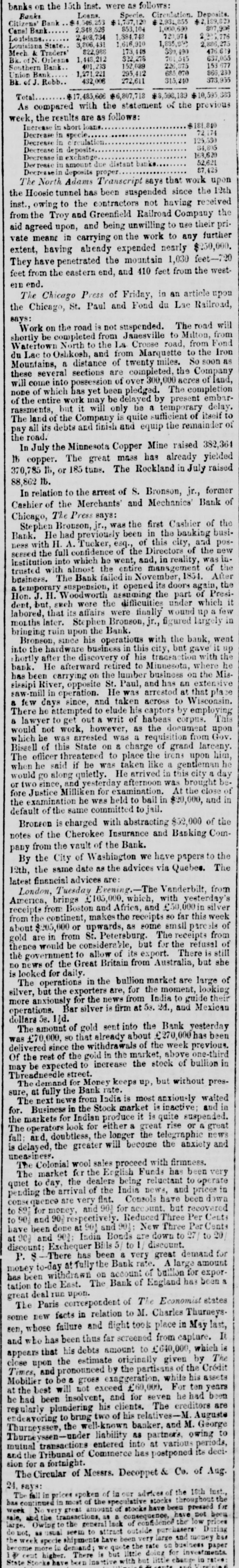 banks on the 15th inst. were as follows: Deposits. Circulation. Loans Specie. Banks 546 $2,189,820 $2,931,855 253 $1,737,120 Citizens' Bank 807,906 1,000,690 853,104 2,348,526 Canal Bank 720,974 2,205,776 1,884,748 2,408,734 Lonisians 1,885,050 2,886,275 1,616,910 3,806,431 Louisiana State. 476.639 173,448 $80,490 $22,988 Mech & Traders' 637,055 701,545 $22,278 1,448,212 Bk. ofN. Orleans 153 677 226,875 152,089 401,233 Southern Bank 866,230 685,070 295,412 1,271,221 Union Bank 373,935 315,240 272,611 432,006 Bk. Robb. $8,598,189 $10,595,88 $6,807,718 $17,485,666 Total As compared with the statement of the previous week, the results are as follows: $181,840 Increase in short loans 72,174 Decrease in specie..... 125,530 Decrease in circulation 34,805 Decrease in deposits. 163,620 Decrease in exchange 52,621 Decrease in amount due distant banks Decressein deposits proper 87,425 The North Adams Transcript says that work upon the Hoosic tunnel has been suspended since the 12th inst., owing to the contractors not having received from the Troy and Greenfield Railroad Company the aid agreed upon, and being unwilling to use their private means in carrying on the work to any further extent, having already expended nearly $250,000. They have penetrated the mountain 1,030 feet-720 feet from the eastern end, and 410 feet from the westenn end. The Chicago Press of Friday, in an article upon the Chicago, St. Paul and Fond du Lac Railroad, says: Work on the road is not suspended. The road will shortly be completed from Janesville to Milton, from Watertown North to the La Crosse road, from Fond du Lac to Oshkosh, and from Marquette to the Iron Mountains, a distance of twenty miles. So soon as these several sections are completed, the Company will come into possession of over 300,000 acres of land, none of which has yet been pledged. The completion of the entire work may be delayed by present embarrassments, but it will only be a temporary delay. The land of the Company is quite sufficient of itself to pay all its debts and finish and equip the remainder of the road. In July the Minnesota Copper Mine raised 382,364 th copper. The great mass has already yielded 370,785 1b, or 185 tuns. The Rockland in July raised 88,862 lb. In relation to the arrest of S. Bronson, jr., former Cashier of the Merchants' and Mechanics' Bank of Chicago, The Press says: Stephen Bronson, jr., was the first Cashier of the Bank. He had previously been in the banking business with H. A. Tucker, esq., of this city, and possessed the full confidence of the Directors of the new institution into which he went, and, in reality, was intrusted with almost the entire management of the business. The Bank failed in November, 1854. After a temporary suspension, it opened its doors again, the Hon. J. H. Woodworth assuming the part of President, but, such were the difficulties under which it labored, that its affairs were finally wound up a few months later. Stephen Bronson, jr., figured largely in bringing ruin upon the Bank. Bronson, since his operations with the bank, went into the hardware business in this city, but gave it up hortly after the discovery of his transaction with the bank. He afterward retired to Minuesota, where he has been carrying on the lumber business on the Mississipi River, opposite St. Paul, and has an extensive saw-mill in operation. He was arrestod at that pla e a few days since, and taken across to Wisconsin. There he attempted to elude his captors by employing a lawyer to get out a writ of habeas corpus. This would not work, however, as the document upon which he was arrested was a requisition from Gov. Bissell of this State on & charge of grand lareeny. The officer threatened to place the irons upon him, when he said if he was taken like a gentleman he would go along quietly. He arrived in this city a day or two since, and yesterday afternoon was brought before Justice Milliken for examination. At the close of the examination he was held to bail in $20,000, and in default of the same committed to jail. Bronson is charged with abstracting $52,000 of the notes of the Cherokee Insurance and Banking Company from the vault of the Bank. By the City of Washington we have papers to the 12th, the same date as the advices via Quebec. The latest financial advices are: London, Tuesday Evening.-The Vanderbilt, from America, brings £105,000, which, with yesterday's receipts from Boston and Africa, and £50,000in silver from the continent, makes the receipts 80 far this week about $205,000 or upwards, as some small pare of gold are in from St. Petersburg. The receipts from thence would be considerable, but for the refusal of the government to allow of its export. There is still no news of the Great Britain from Australia, but she is looked for daily. The operations in the bullion market are large of silver, but the exporters are, for the moment, looking more anxiously for the news from India to guide their operations. Bar silver is firm at 53. 2d., and Mexican dollars 5s. 11d. The amount of gold sent into the Bank yesterday was £70,000, SO that already about has been delivered since the withdrawals of the week previous. Of the rest of the gold in the market, above one-third may be expected to increase the stock of bullion in Threadneedle street. The demand for Money keeps up, but without pressure, at fully the Bank rate. The next news from India is most anxiously waited for. Business in the Stock market is inactive; and in the markets for Indian produce it is quite suspended. The operators look for either a great rise or a great fall: and, doubtless, the longer the telegraphic news is delayed, the greater will become the anxiety and uneasiness. The Colonial wool sales proceed with firmness. The market for the English Funds has been very quiet to day, the dealers being reluctant to operate pending the arrival of the India news, and prices in conse quence are very flat. Consols have been down to 891 for money, and 901 for acc ou