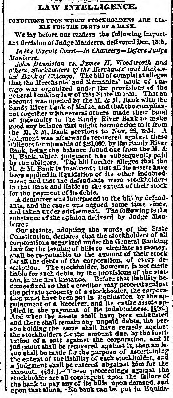 LAW INTELLIGENCE. CONDITIONS UPON WHICH STOCKHOLDERS ARE LIABLE FOR THE DEBTS or 4 BANK. We lay before our readers the following importabt decision of Judge Manierre, delivered Dec. 13:h. In the Circuit Court-In Chancery-Before Judge Masierre. John Denniston If. James II. Woodworth and others. Stockholders of the Merchands' and Mechanics' Bank of Chicago. The bill of complaint alleges that the Merchants' and Mechanics' Bank of thicago was organized under the provisions of the general banking law of this State in 1551. That an account was opened by the M. & M. Bank with the Sandy River Bank of Maine, and that the complianant together with several others made their bond of indemnity to the Sundy River Bank to make good any balance that might become due to it from the M. $ M. Bank previous 10 Nov. 28. 1854. A Jadgment was afterwards recovered against these obligors for upwards of $3,000. by the Saudy River Bank, being the balance found due from the M. & M. Bank, which judgment was subsequently paid by the obligors. The bill further alleges that the M. & M. Bank is insolvent: that all its assets have been applied in liquidation of its other Indebtedneed; and that the defendants were stockholders In that Bank and liable to the extent of their stock for the payment of its debts. A demarrer was interposed to the bill by defendants, and the cause was argued some time -ince, and taken under advisement. The following is the substance of the opinion deliverd by Judge Manierre: Our statute, adopting the words of the State Constitution, declares that the stockholders of all corporations organized under the General Banking Law for the issuing of bills to circulate as money, shall be responsible to the amount of their stock for all the debts of the corporation, of every de"cription. The stockholder, however, is not made liable for such debts, by the provisions of the visiute, in the first instance. Before that liability be comes fixed so that a creditor may proceed against the private property of a stockholder, the corporstion must have been pat in liquidation by the appointment of a Receiver. and its entire assets applied in the payment of Its indebtedness. [190] And when the assets shall have been exhausted and there shall remain any unpaid debts, the perFOR holding the same shall have remedy against the stockholders for the amount due. by the institution of a enit against the corporation. and if jud :ment shall be recovered against it, then as isaue shall be made for the purpose of ascertaining the extent of the liability of each stockholder, and a judgment shall be entered abgainst him for the amount. 1933.1. These proceedings against the stockbolder are all contingent upon the failure of the bank to pay any of its bills upon demand, and upon that alone, No bank can be put in liquida-