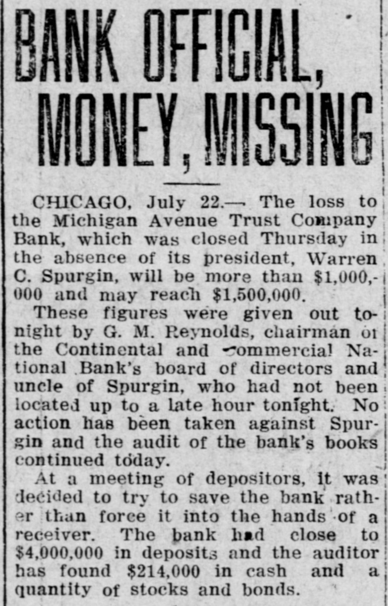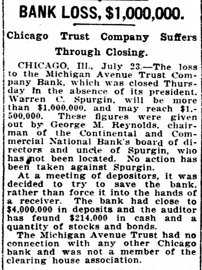 BANK LOSS, $1,000,000. Chicago Trust Company Suffers Through Closing. CHICAGO, Ill., July 23.-The loss to the Michigan Avenue Trust Company Bank, which was closed Thursday in the absence of its president. Warren C. Spurgin, will be more than $1,000,000. and may reach $1.500,000. These figures were given out by George M. Reynolds, chairman of the Continental and Commercial National Bank's board of directors and uncle of Spurgin, who has not been located. No action has been taken against Spurgin. At a meeting of depositors, it was decided to try to save the bank. rather than force it into the hands of a receiver. The bank had close to $4,000.000 in deposits and the auditor has found $214,000 in cash and a quantity of stocks and bonds. The Michigan Avenue Trust had no connection with any other Chicago bank and was not a member of the clearing house association.