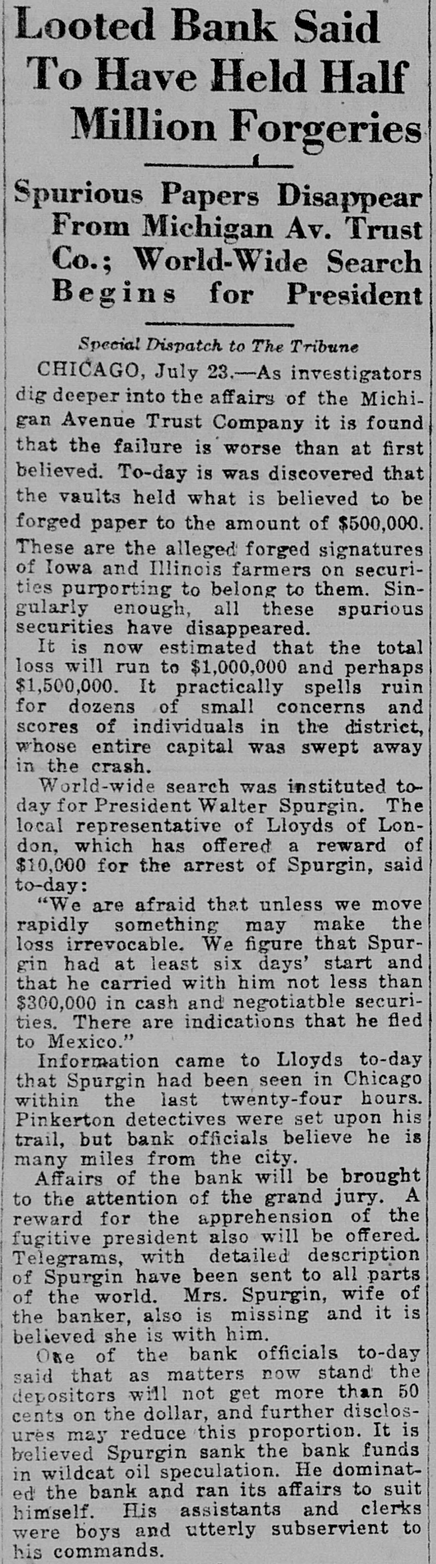 Looted Bank Said To Have Held Half Million Forgeries f Spurious Papers Disappear From Michigan Av. Trust Co.; World-Wide Search Begins for President Special Dispatch to The Tribune CHICAGO, July 23.-As investigators dig deeper into the affairs of the Michigan Avenue Trust Company it is found that the failure is worse than at first believed. To-day is was discovered that the vaults held what is believed to be forged paper to the amount of $500,000. These are the alleged forged signatures of Iowa and Illinois farmers on securities purporting to belong to them. Singularly enough, all these spurious securities have disappeared. It is now estimated that the total loss will run to $1,000,000 and perhaps $1,500,000. It practically spells ruin for dozens of small concerns and scores of individuals in the district, whose entire capital was swept away in the crash. World-wide search was instituted to day for President Walter Spurgin. The local representative of Lloyds of London, which has offered a reward of $10,000 for the arrest of Spurgin, said to-day: "We are afraid that unless we move rapidly something may make the loss irrevocable. We figure that Spurgin had at least six days' start and that he carried with him not less than $300,000 in cash and negotiatble securities. There are indications that he fled to Mexico." Information came to Lloyds to-day that Spurgin had been seen in Chicago within the last twenty-four hours. Pinkerton detectives were set upon his trail, but bank officials believe he is many miles from the city. Affairs of the bank will be brought to the attention of the grand jury. A reward for the apprehension of the fugitive president also will be offered. Telegrams, with detailed description of Spurgin have been sent to all parts of the world. Mrs. Spurgin, wife of the banker, also is missing and it is believed she is with him. One of the bank officials to-day said that as matters now stand the depositors will not get more than 50 cents on the dollar, and further disclosures may reduce this proportion. It is believed Spurgin sank the bank funds in wildcat oil speculation. He dominated the bank and ran its affairs to suit himself. His assistants and clerks were boys and utterly subservient to his commands.
