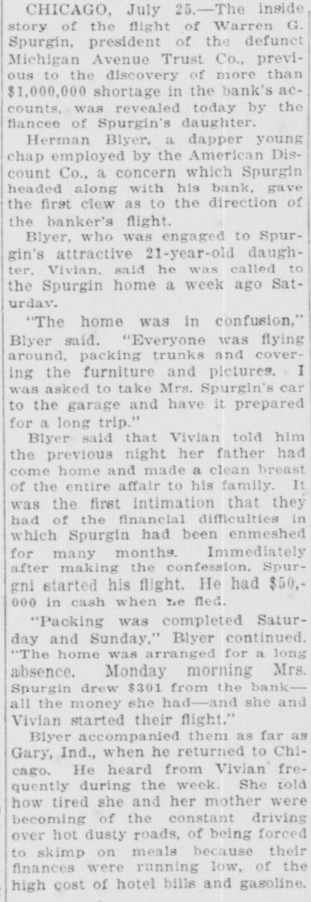 CHICAGO, July 25.-The inside story of the flight of Warren G. Spurgin, president of the defunct Michigan Avenue Trust Co., previous to the discovery of more than $1,000,000 shortage in the bank's accounts, was revealed today by the fiancee of Spurgin's daughter. Herman Blyer, a dapper young chap employed by the American Discount Co., a concern which Spurgin headed along with his bank, gave the first clew as to the direction of the banker's flight. Blyer, who was engaged to Spurgin's attractive 21-year-old daughter, Vivian, said he was called to the Spurgin home a week ago Saturday. "The home was in confusion," Blyer said. "Everyone was flying around, packing trunks and covering the furniture and pictures. I was asked to take Mrs. Spurgin's car to the garage and have it prepared for a long trip." Blyer said that Vivian told him the previous night her father had come home and made a clean breast of the entire affair to his family. It was the first intimation that they had of the financial difficulties in which Spurgin had been enmeshed for many months. Immediately after making the confession, Spurgni started his flight. He had $50,000 in cash when I.e fled. "Packing was completed Saturday and Sunday," Blyer continued. "The home was arranged for a long absence. Monday morning Mrs. Spurgin drew $301 from the bankall the money she had-and she and Vivian started their flight." Blyer accompanied them as far as Gary, Ind., when he returned to Chicago. He heard from Vivian frequently during the week. She told how tired she and her mother were becoming of the constant driving over hot dusty roads, of being forced to skimp on meals because their finances were running low, of the high cost of hotel bills and gasoline.