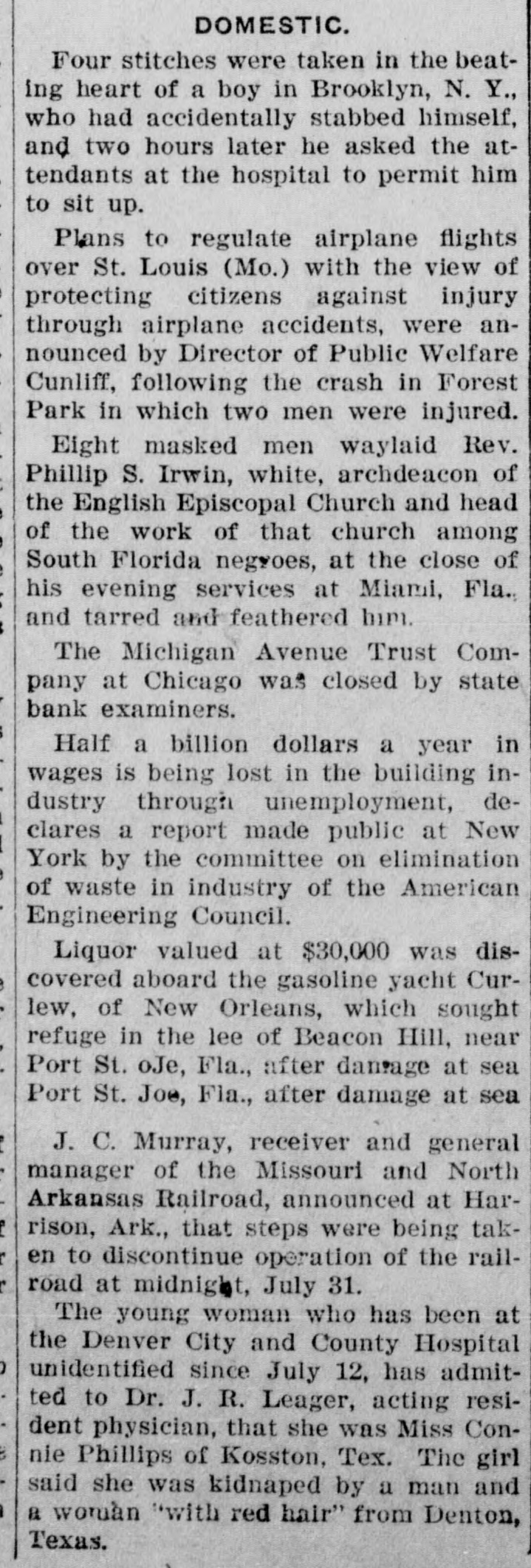 DOMESTIC. Four stitches were taken in the beating heart of a boy in Brooklyn, N. Y., who had accidentally stabbed himself, and two hours later he asked the attendants at the hospital to permit him to sit up. Plans to regulate airplane flights over St. Louis (Mo.) with the view of protecting citizens against injury through airplane accidents, were announced by Director of Public Welfare Cunliff, following the crash in Forest Park in which two men were injured. Eight masked men waylaid Rev. Phillip S. Irwin, white, archdeacon of the English Episcopal Church and head of the work of that church among South Florida negroes, at the close of his evening services at Miami, Fla., and tarred and feathered him. The Michigan Avenue Trust Company at Chicago was closed by state bank examiners. Half a billion dollars a year in wages is being lost in the building industry through unemployment, declares a report made public at New York by the committee on elimination of waste in industry of the American Engineering Council. Liquor valued at $30,000 was discovered aboard the gasoline yacht Curlew, of New Orleans, which sought refuge in the lee of Beacon Hill, near Port St. oJe, Fla., after damage at sea Port St. Joe, Fla., after damage at sea J. C. Murray, receiver and general manager of the Missouri and North Arkansas Railroad, announced at Harrison, Ark., that steps were being taken to discontinue operation of the railroad at midnight, July 31. The young woman who has been at the Denver City and County Hospital unidentified since July 12, has admitted to Dr. J. R. Leager, acting resident physician, that she was Miss Connie Phillips of Kosston, Tex. The girl said she was kidnaped by a man and a woman "with red hair" from Denton, Texas.