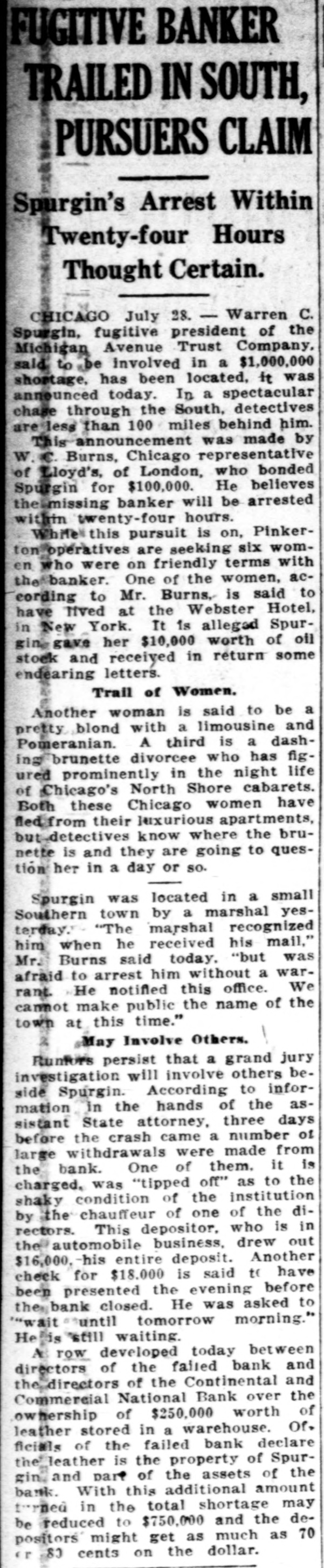 FUGITIVE BANKER TRAILED IN SOUTH, PURSUERS CLAIM Spurgin's Arrest Within Twenty-four Hours Thought Certain. CHICAGO July 28. - Warren C. Spurgin, fugitive president of the Michigan Avenue Trust Company. said to be involved in a $1,000,000 shortage. has been located, it was announced today. In a spectacular chage through the South, detectives are less than 100 miles behind him. by This announcement was made W.C. Burns, Chicago representative of Lloyd's, of London, who believes bonded Spurgin for $100,000. He thelmissing banker will be arrested within twenty-four hours. White pursuit is on, Pinkerton operatives are seeking six women who were on friendly terms with the banker. One of the women, according to Mr. Burns, is said to have Tived at the Webster Hotel, in New York. It is alleged Spur- oil ging gave her $10,000 worth of stock and received in return some endearing letters. Trail of Women. Another woman is said to be a pretty blond with a limousine dash- and Pomeranian. A third is a ing brunette divorcee who has fig- life ured prominently in the night of Chicago's North Shore cabarets. have Both these Chicago women fled from their luxurious apartments, bruut detectives know where the nette is and they are going to question her in a day or so. Spurgin was located in a small Southern town by a marshal yestarday. "The marshal recognized him when he received his mail," was Mr. Burns said today. "but afraid to arrest him without a war- We He notified this office. cannot rant. make public the name of the town at this time." & May Involve Others. Funfore persist that a grand jury investigation will involve others beside Spurgin. According to information in the hands of the assistant State attorney. three days before the crash came a number from of large withdrawals were made it is the bank. One of them. charged. was "tipped off" as to the shaky condition of the institution dithe chauffeur of one of the is in rectors. by This depositor. who out the automobile business. drew $16,000. his entire deposit. Another have check for $18.000 is said t been presented the evening before to bank closed. He was asked "wait they until tomorrow morning." Helis still waiting AB row developed today between and directors of the failed bank the directors of the Continental and the Commercial National Bank over of ownership of $250,000 worth Of. leather stored in a warehouse. ficials of the failed bank declare the leather is the property of Spur- the gin and part of the assets of bank. With this additional amount terned in the total shortage may dereduced to $750,000 and the 70 be positors might get as much as or 80 cents on the dollar.