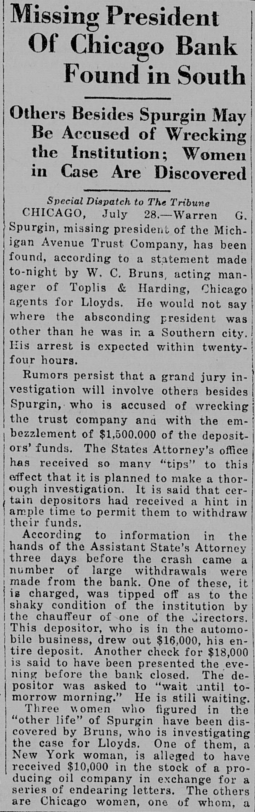 Missing President Of Chicago Bank Found in South Others Besides Spurgin May Be Accused of Wrecking the Institution; Women in Case Are Discovered Special Dispatch to The Tribune CHICAGO, July 28.-Warren G. Spurgin, missing president of the Michigan Avenue Trust Company, has been found, according to a statement made to-night by W. C. Bruns, acting manager of Toplis & Harding, Chicago agents for Lloyds. He would not say where the absconding president was other than he was in a Southern city. His arrest is expected within twentyfour hours. Rumors persist that a grand jury investigation will involve others besides Spurgin, who is accused of wrecking the trust company and with the embezzlement of $1,500.000 of the depositors' funds. The States Attorney's office has received so many "tips" to this effect that it is planned to make a thorough investigation. It is said that certain depositors had received a hint in ample time to permit them to withdraw their funds. According to information in the hands of the Assistant State's Attorney three days before the crash came a number of large withdrawals were made from the bank. One of these, it is charged, was tipped off as to the shaky condition of the institution by the chauffeur of one of the Cirectors. This depositor, who is in the automobile business, drew out $16,000, his entire deposit. Another check for $18,000 is said to have been presented the evening before the bank closed. The depositor was asked to "wait until tomorrow morning." He is still waiting. Three women who figured in the "other life" of Spurgin have been discovered by Bruns, who is investigating the case for Lloyds. One of them, a New York woman, is alleged to have received $10,000 in the stock of a producing oil company in exchange for a series of endearing letters. The others are Chicago women, one of whom, a