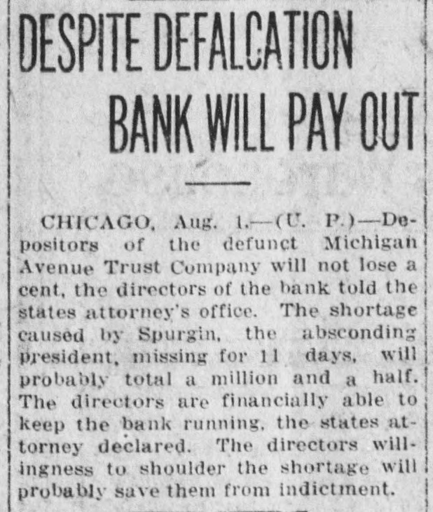 DESPITE DEFALCATION BANK WILL PAY OUT CHICAGO, Aug. 1.-(U. P.)-Depositors of the defunct Michigan Avenue Trust Company will not lose a cent, the directors of the bank told the states attorney's office. The shortage caused by Spurgin, the absconding president, missing for 11 days, will probably total a million and a half. The directors are financially able to keep the bank running, the states attorney declared. The directors willingness to shoulder the shortage will probably save them from indictment.