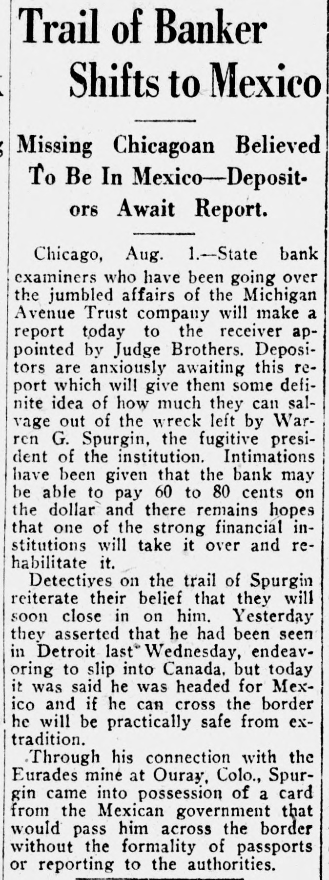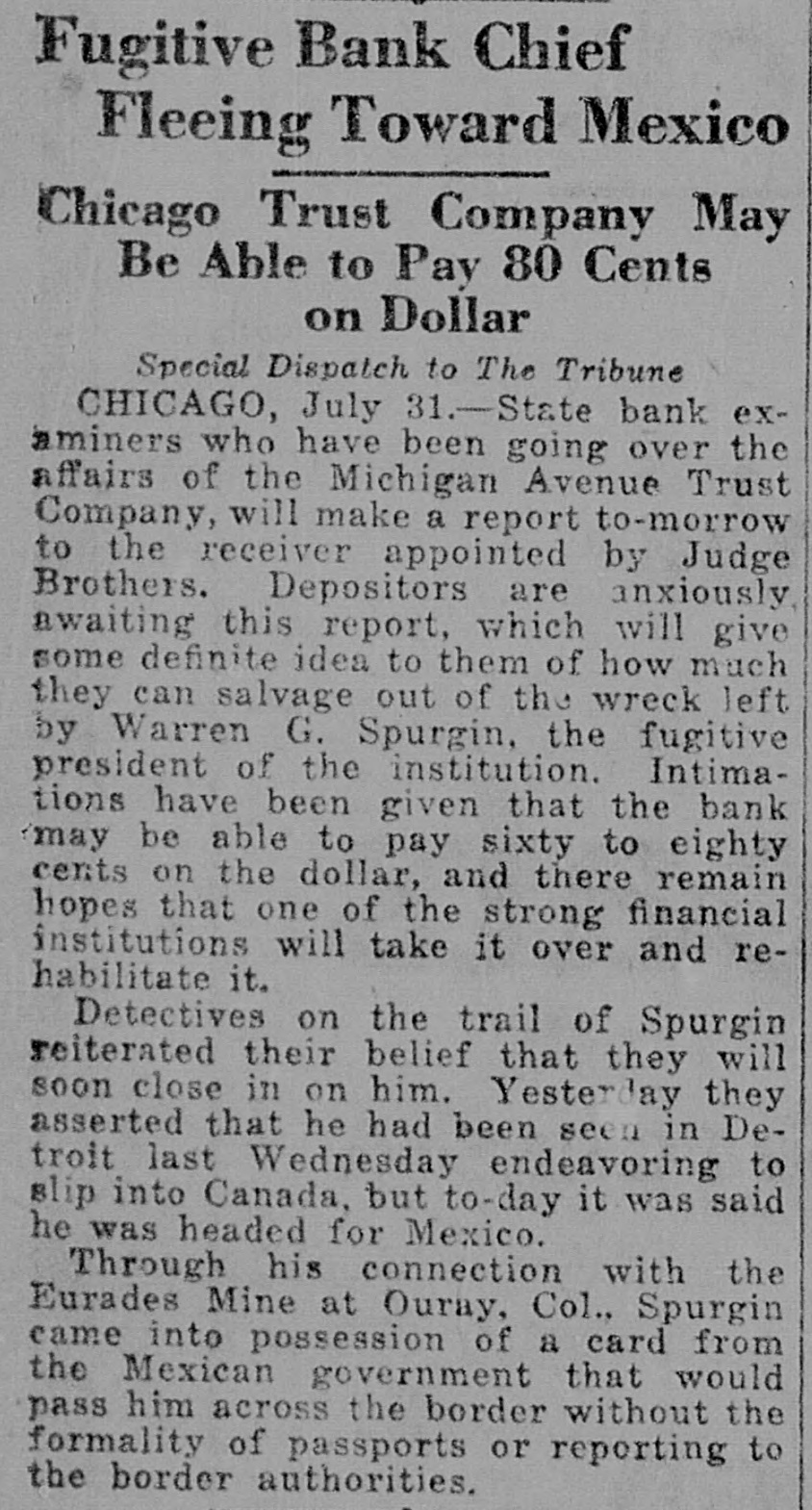 Fugitive Bank Chief Fleeing Toward Mexico Chicago Trust Company May Be Able to Pay 80 Cents on Dollar Special Dispatch to The Tribune CHICAGO, July 31.-State bank examiners who have been going over the affairs of the Michigan Avenue Trust Company, will make a report to-morrow to the receiver appointed by Judge Brothers. Depositors are anxiously awaiting this report, which will give some definite idea to them of how much they can salvage out of the wreck left by Warren G. Spurgin, the fugitive president of the institution. Intimations have been given that the bank may be able to pay sixty to eighty cents on the dollar, and there remain hopes that one of the strong financial institutions will take it over and rehabilitate it. Detectives on the trail of Spurgin reiterated their belief that they will soon close in on him. Yesterday they asserted that he had been seen in Detroit last Wednesday endeavoring to slip into Canada, but to-day it was said he was headed for Mexico. Through his connection with the Eurades Mine at Ouray, Col., Spurgin came into possession of a card from the Mexican government that would pass him across the border without the formality of passports or reporting to the border authorities.