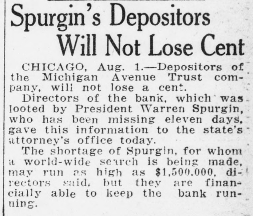 Spurgin's Depositors Will Not Lose Cent CHICAGO, Aug. 1.-Depositors of the Michigan Avenue Trust company, will not lose a cent. Directors of the bank, which was looted by President Warren Spurgin, who has been missing eleven days. gave this information to the state's attorney's office today. The shortage of Spurgin, for whom it world-wide search is being made, may run as high as $1,500,000. directors said. but they are financially able to keep the bank runuing.